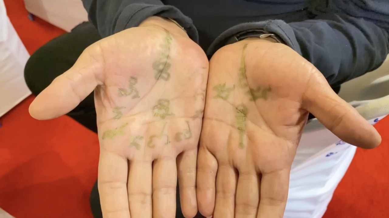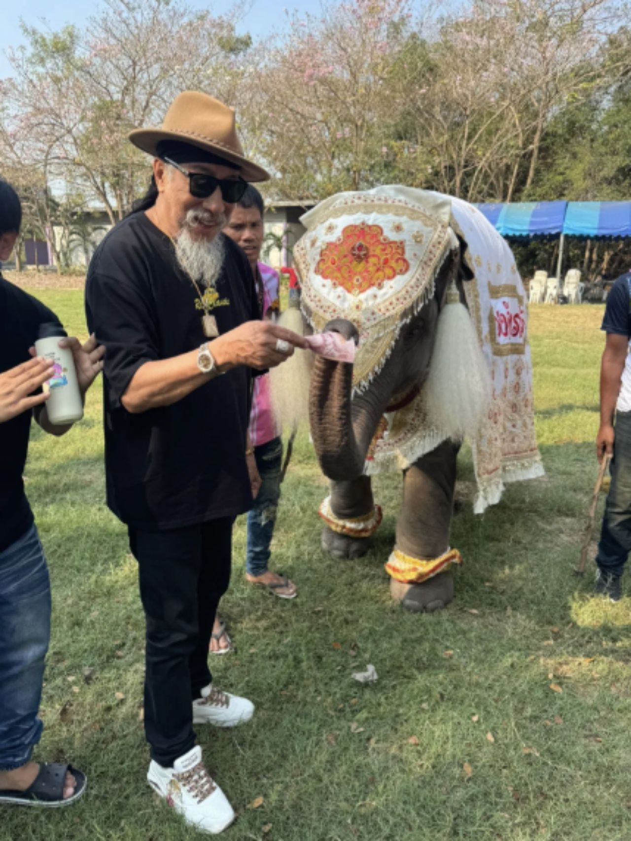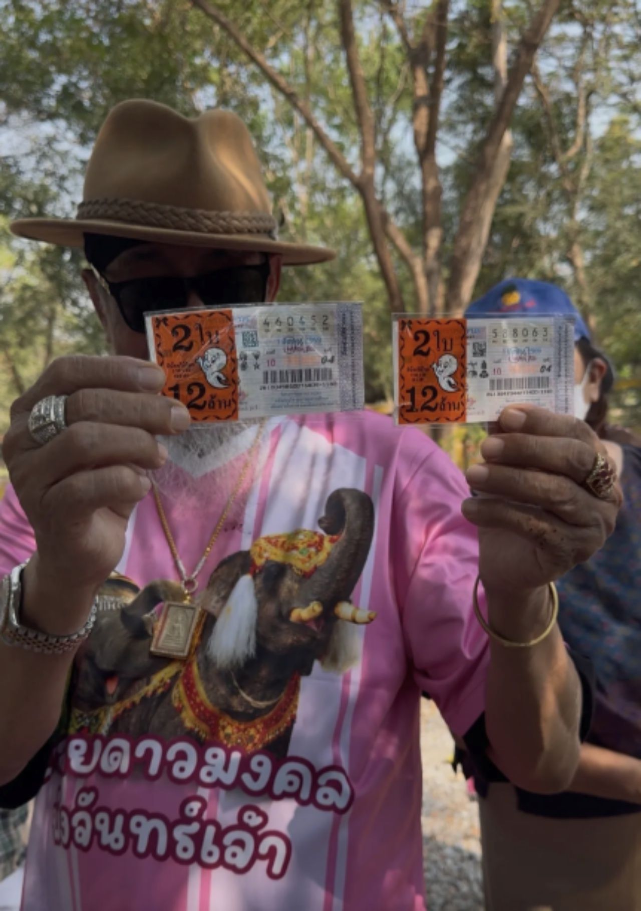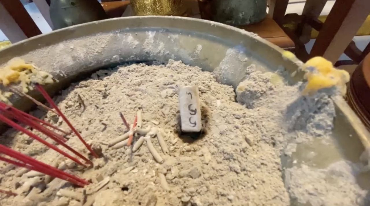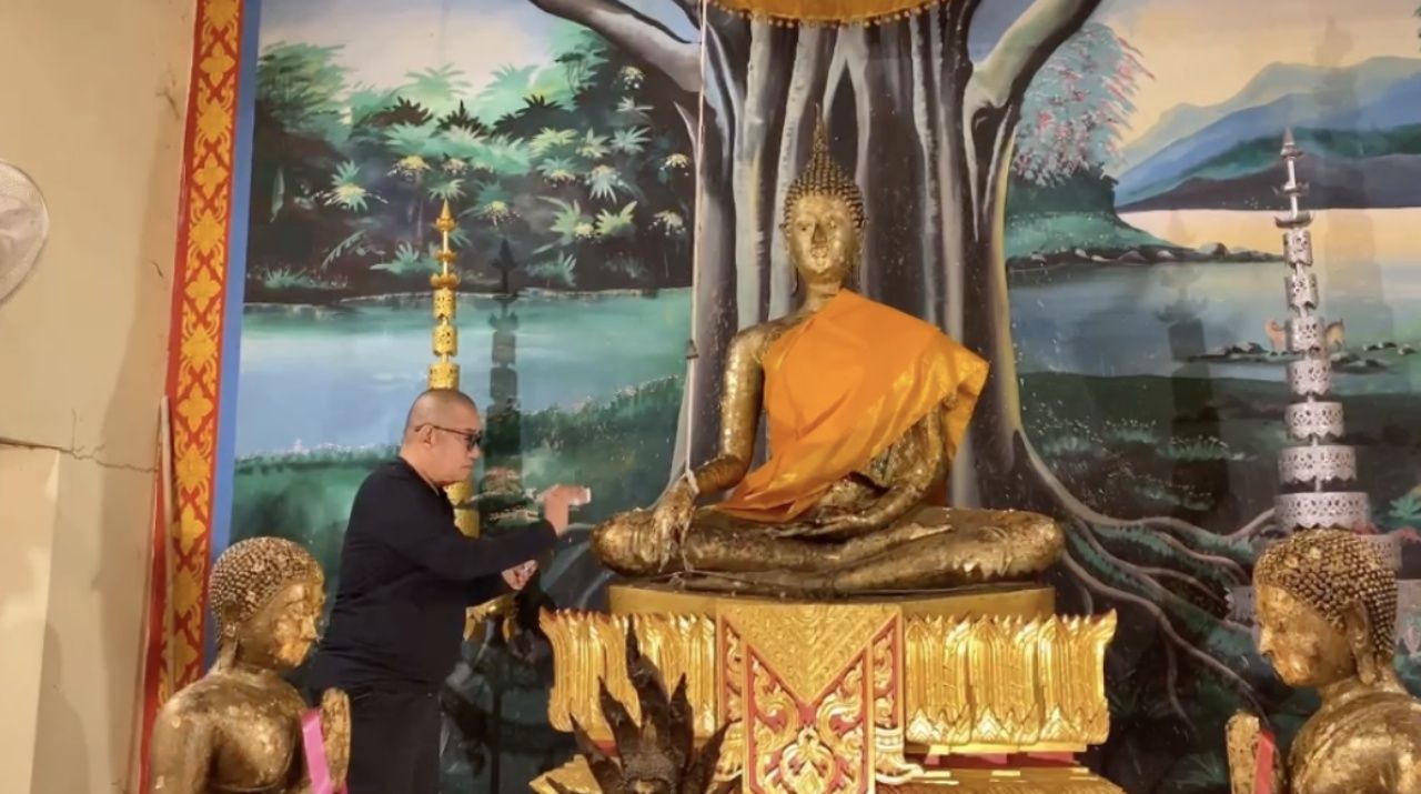 - Next is senior comedian Giant Chernyim, who recently made merit at Wat Phai Sam Tamleung, Bang Len District, Nakhon Pathom. He went to pray beforethe principal Buddha statueinside the ordination hall. At the same time, he asked the current abbot, Phra Ajarn Lek, to inscribe a wealthy patron's talisman onto his palm to enhance good fortune. He also had the head of Lord Ganesha blessed to boost luck even more. To cap it off, he shared two lucky numbers obtained by burning incense sticks himself, which are visible in the photo.