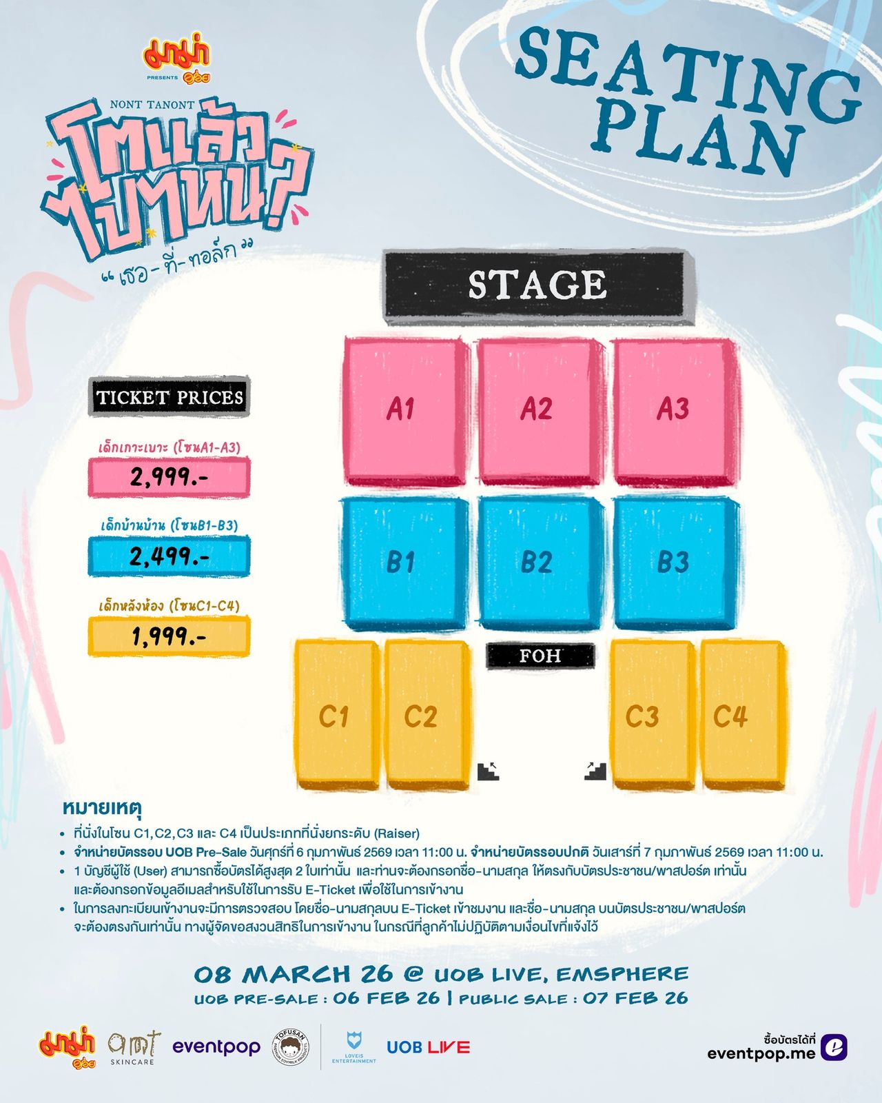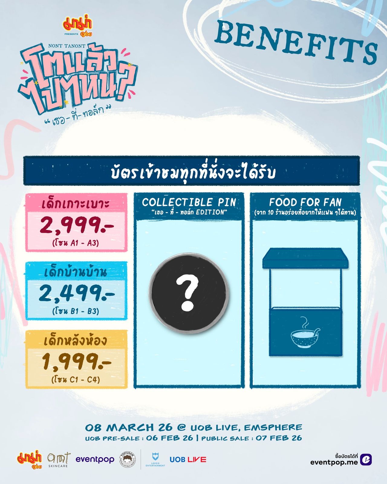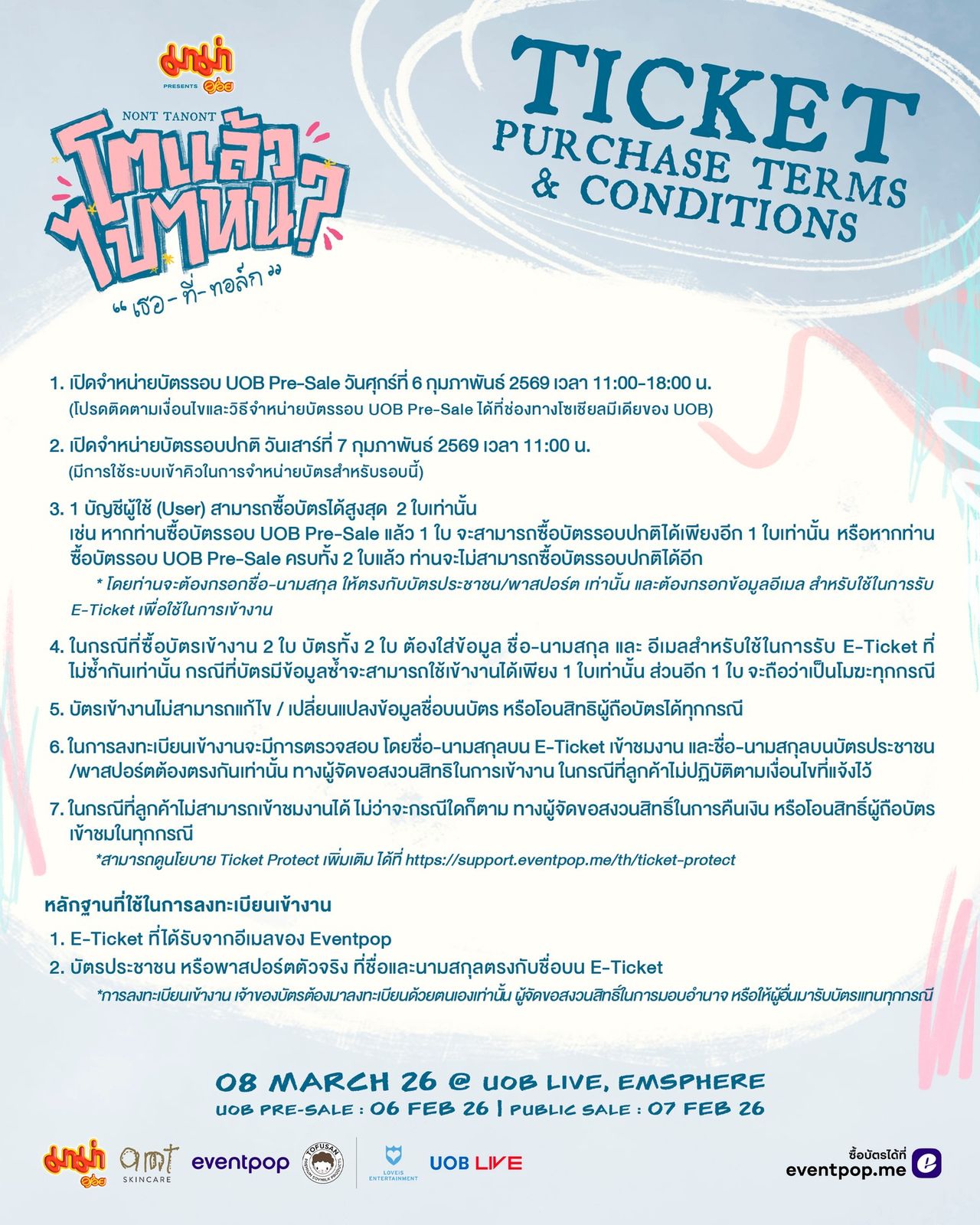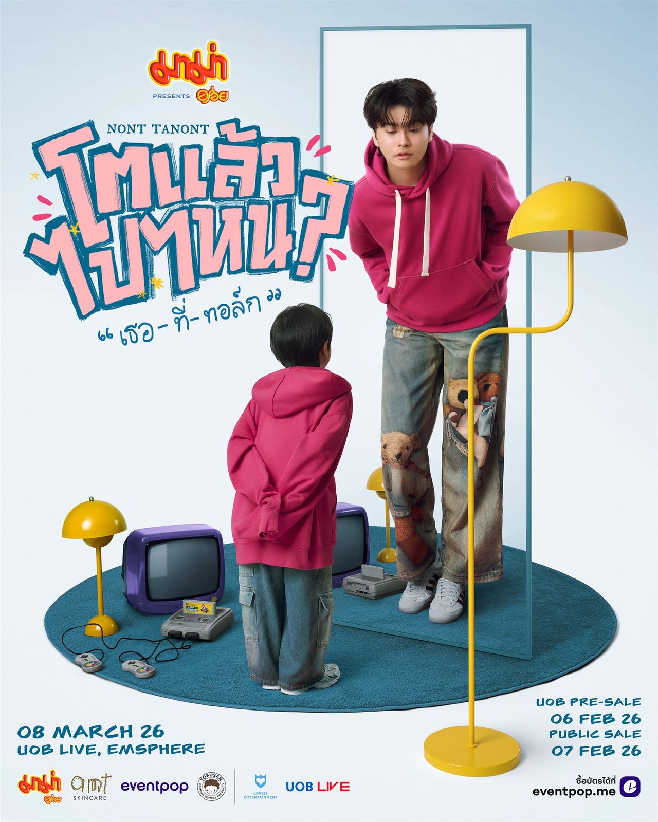 Join Nont Tanont in finding answers and celebrating his 30th birthday at “Mama Presents NONT TANONT Where To Next at 30? ‘You-At-Talk’” on Saturday, 8 March 2026, at UOB LIVE, EMSPHERE. Tickets are priced at 2,999, 2,499, and 1,999 baht. Seats can be reserved on 6 February 2026 during the UOB Pre-Sale and on 7 February 2026 for the general public through Eventpop or the Eventpop website.