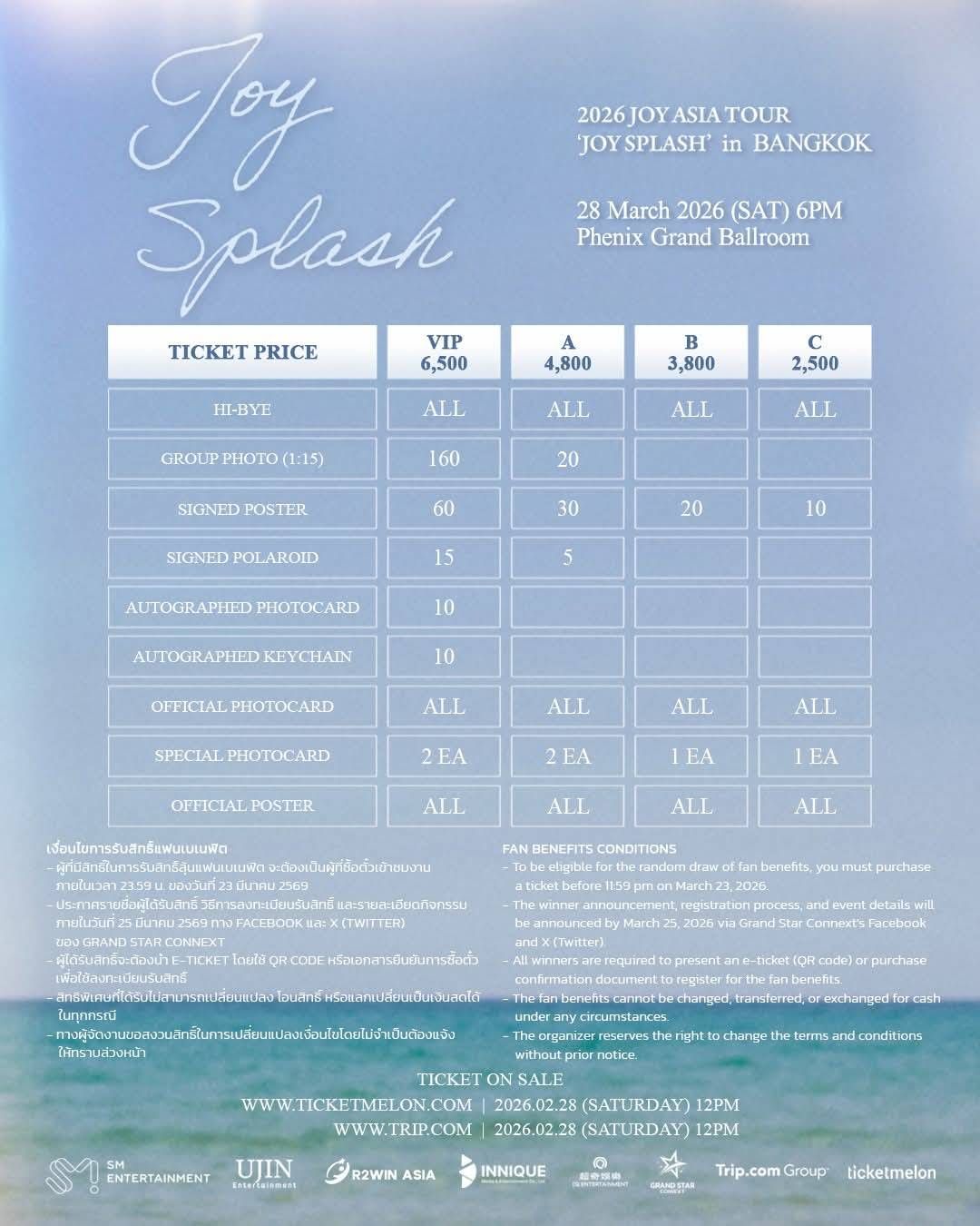 Thai ReVeluvs, prepare your hearts to be filled by "Joy" at the 2026 JOY ASIA TOUR ‘JOY SPLASH’ in BANGKOK on Saturday, 28 March 2026, at Phenix Grand Ballroom. Tickets will be available from 28 February 2026 at 12:00 noon via ticketmelon.com and trip.com. Prices are 6,500, 4,800, 3,800, and 2,500 baht. A special highlight not to be missed: every seat includes the HI BYE privilege.