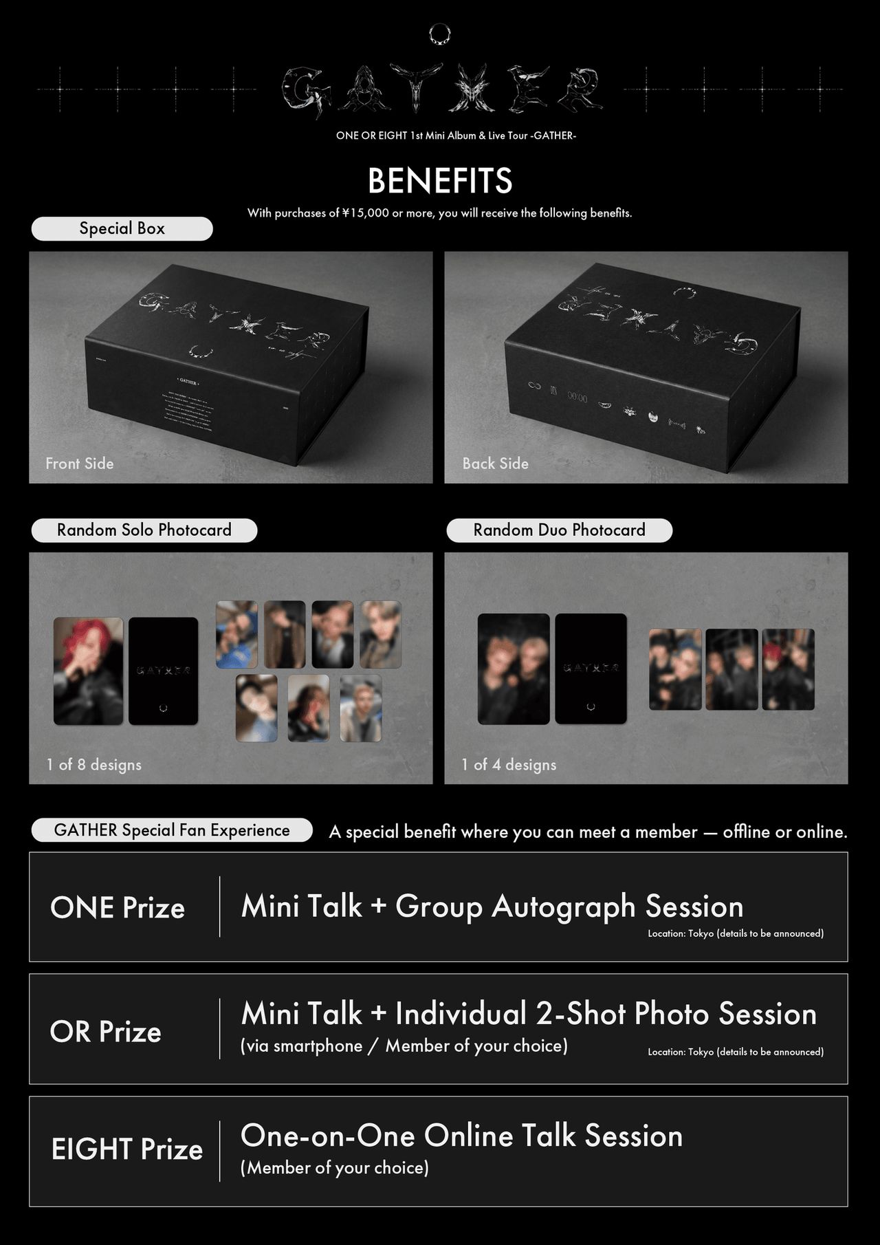 This collection features items designed to celebrate the "GATHER" era, including postcards, pin button sets, member-designed keychains, handkerchiefs, scarves, T-shirts, hoodies, photo card sleeves, and carabiners. Fans who purchase merchandise meeting the minimum spending requirement will receive special bonuses such as solo photo cards, duo photo cards, special collector’s boxes, and the chance to attend an exclusive fan meeting with ONE OR EIGHT. These benefits are available for a limited time from 4 December 2025 to 3 February 2026 or while supplies last. More details can be found here.