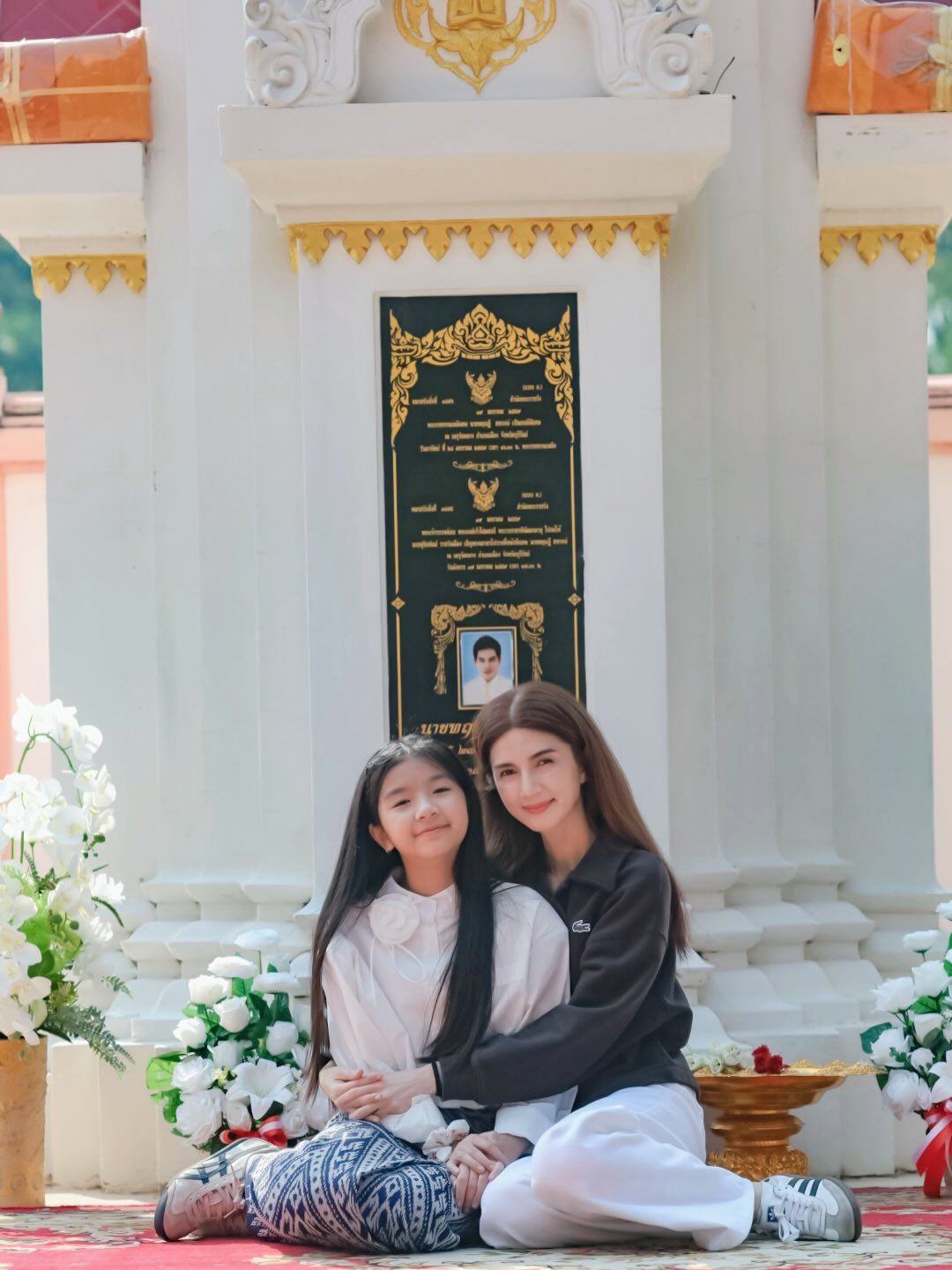 This year, Nong Mali has grown into a young lady, wearing a traditional sinh (Thai skirt) and a long-sleeve white shirt to make merit for her father, Por. Fans who have followed them all agree that Nong Mali has grown up, now as tall as her grandmother and uncles, and many still love and remember Por Trisdee fondly.