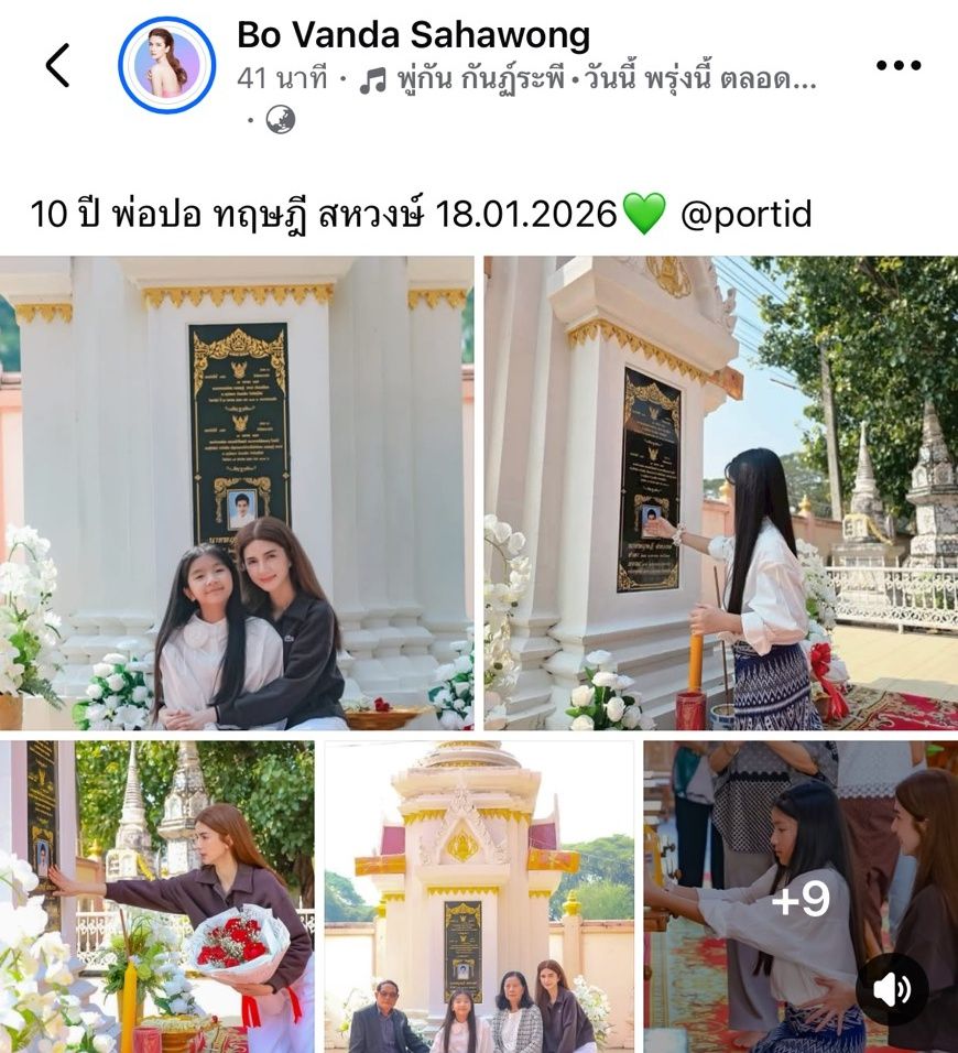 For example, fans commented: "Time passes so quickly; if Por were still here, he would be 45-46 years old. Nong Mali has become a young lady and shows the artistic talent like her father. Por remains in our hearts always." "Mali is the loveliest person, representing the warmth of the family." "Por is an actor who will always be remembered." "It's already been 10 years; time flies, but we always remember him." "Por must be watching proudly as Bow raises Nong Mali so well; she's adorable like her father." "Bow has done an excellent job raising Nong Mali—a great mother. We look forward to Nong Mali's future as a leading actress; talent runs in the family."