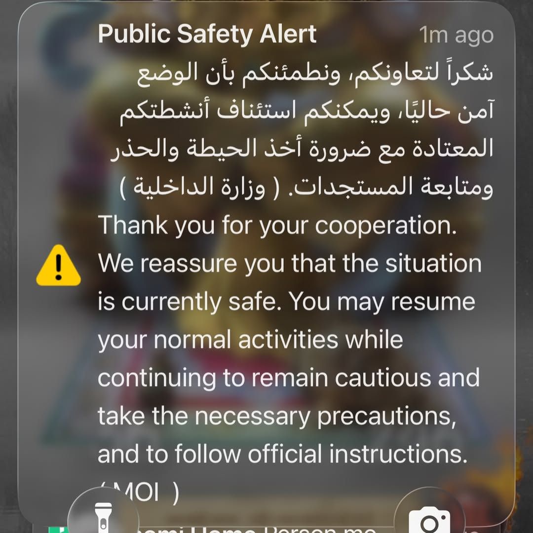 After the tense 40-minute period, the situation began to ease. The local Ministry of Interior sent a message confirming safety, stating that conditions had returned to normal and people could resume activities as usual, though caution was still advised.