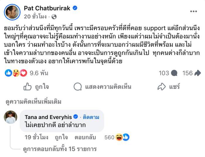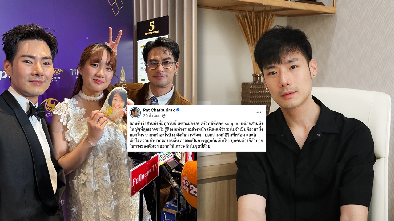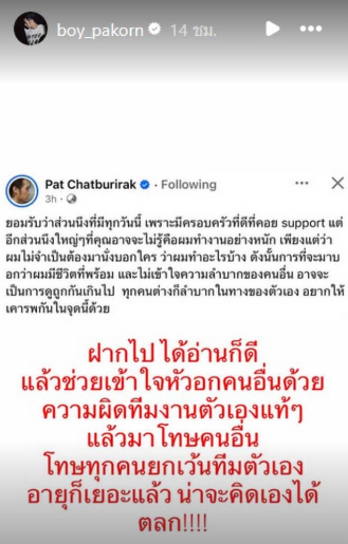 The entire Chatborirak family appeared together at an event, led by Boy Pakorn. Along with his younger brother, Pat, and Wanmai. They opened up about the issue in which Pat posted a fiery message on social media about work problems, encountering ugly and narrow-minded behavior, prompting his two older brothers to defend him. Pat shared that