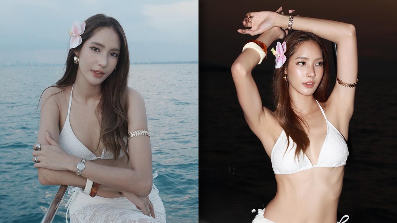 Recently, Baimon Kittiya took a relaxed trip to the beach, leisurely sailing and posting photos and clips flaunting her sexy, flawless figure—wearing a white bikini top showing off her ample chest and a sheer lace-patterned bottom—accompanied by the short caption “Just letting my mind enjoy.”