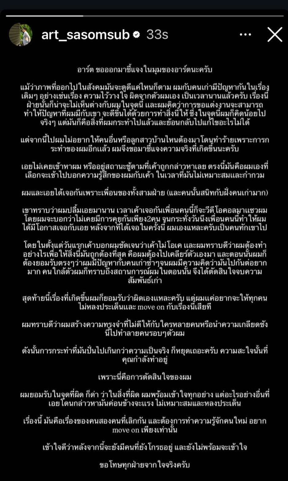 "Art Sasomsap" the former boyfriend of "Grace Chalita" has come forward via his personal Instagram to clarify the relationship drama currently under public scrutiny.