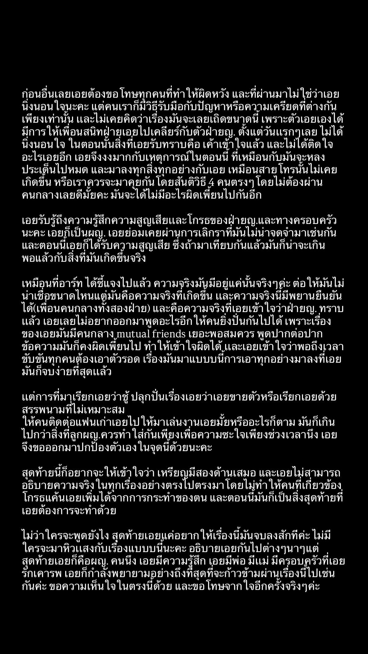 Aey issued a lengthy clarification after being linked as the third party responsible for the breakup of Art Sasomsap and Grace Chalita 's relationship.