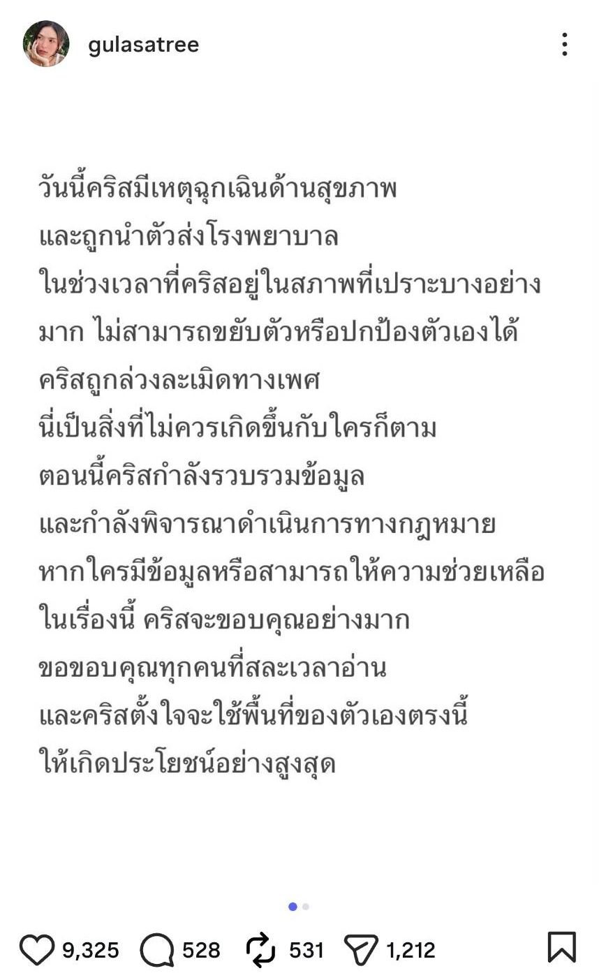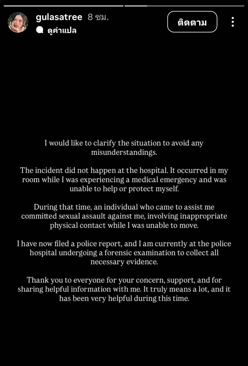 Later, Kristin Gulasatree posted an additional explanation in English on Instagram, which translates as: "I want to clarify the situation to avoid any misunderstandings. The incident did not occur at the hospital but in my room while I was facing a medical emergency and unable to help or protect myself.
