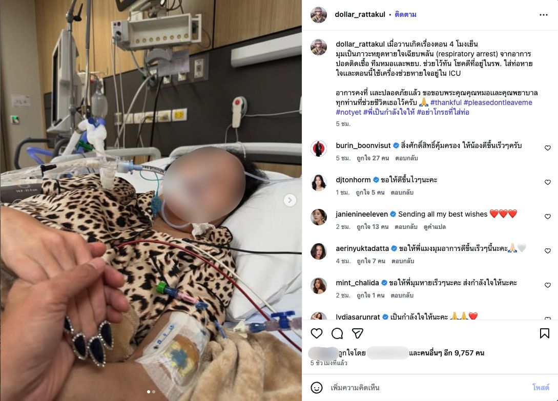 On his Instagram @dollar_rattakul, he posted a photo of Lady Spider in a hospital bed and provided the latest update: “Yesterday at 4 p.m., she experienced acute respiratory arrest from pneumonia.