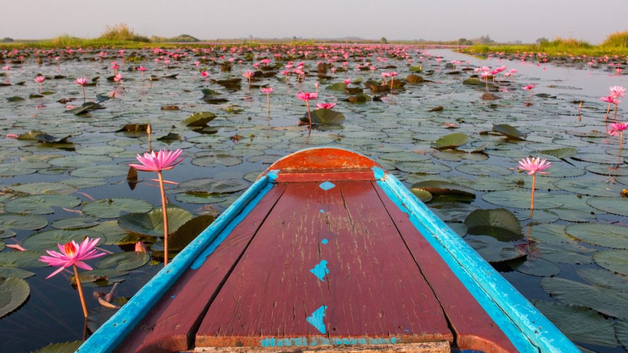 The Red Lotus Sea is located at Nong Han Kumphawapi in Kumphawapi District, Udon Thani Province, in northeastern Thailand. Nong Han is a large natural freshwater swamp covering over 36 square kilometers, surrounded by rich nature including various fish species, numerous birds, and diverse aquatic plants. Especially in winter, the red lotuses bloom fully, turning the water surface into a stunning pink carpet.