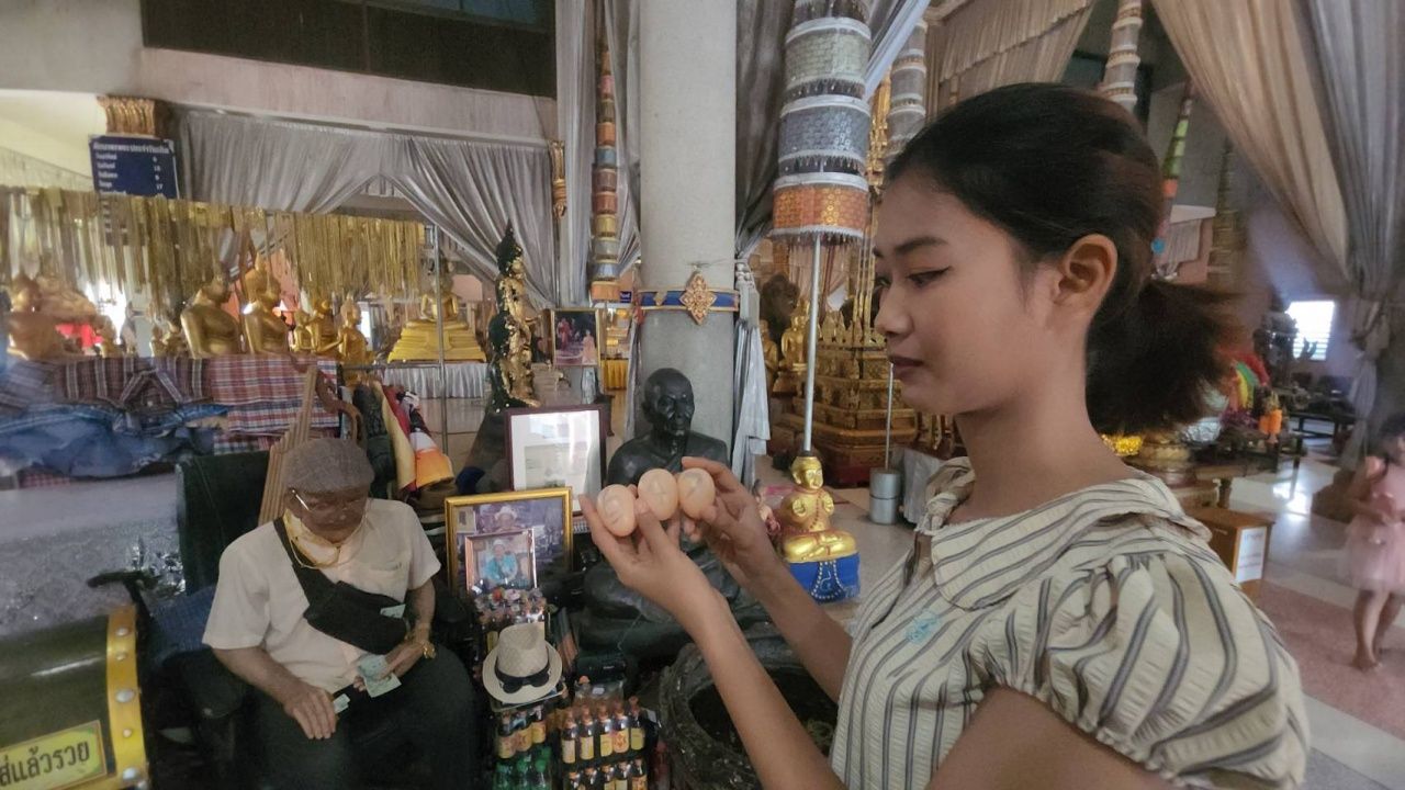 She lifted a jar above her head, praying for a big win and promised to return to make merit by buying supplies to help southern flood victims. Then she reached into the golden jar in front of Ta Thong Ngiu Rai and pulled out three eggs, which revealed the numbers 6, 4, and 7.
