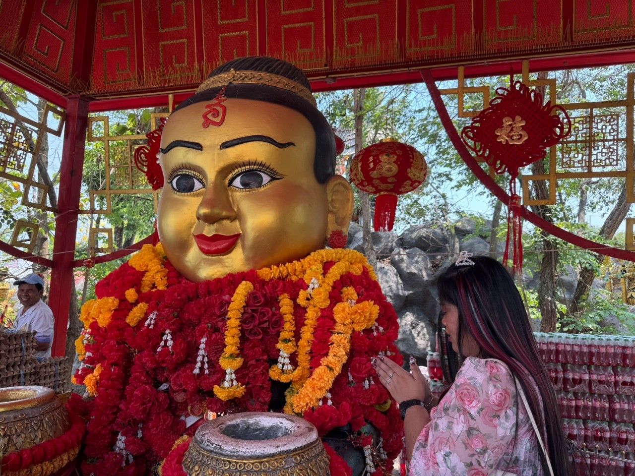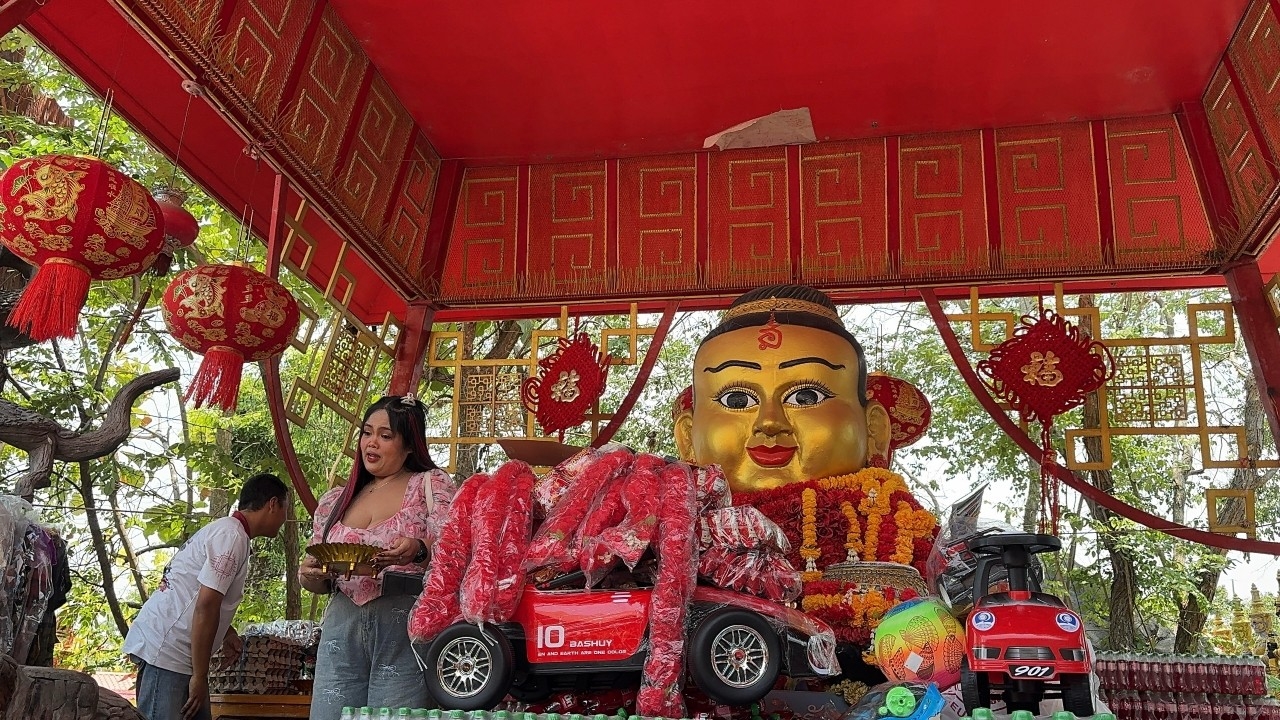 A woman won a large lottery prize in the hundreds of thousands and returned to pay respects to the Wealthy Child Spirit at the Ruesi Nen Hermitage for the second time, drawing "lucky numbers" with ping pong balls for the 16 April 2026 lottery.