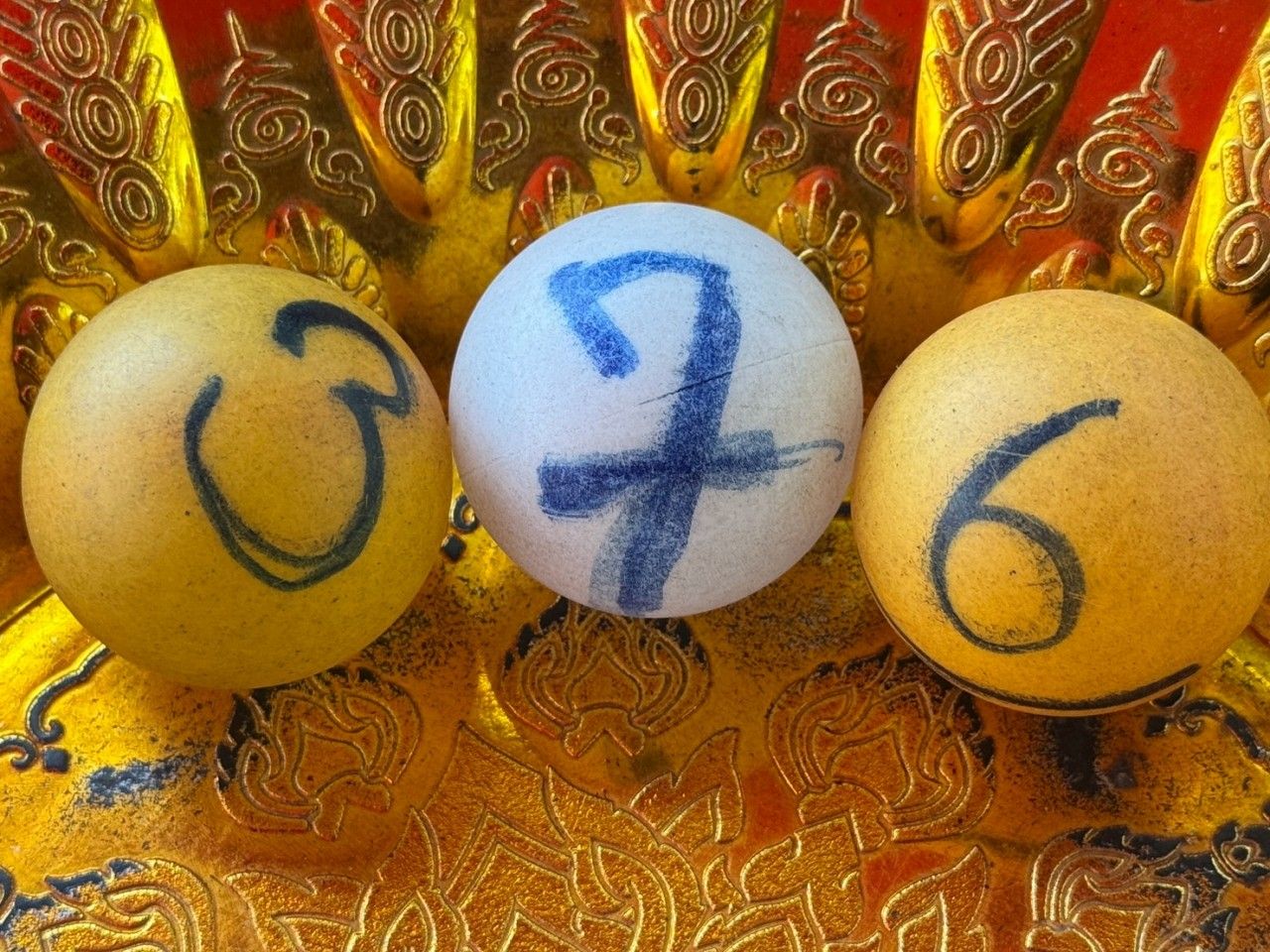 Before leaving, Ms. Supitchaya drew ping pong balls bearing the Wealthy Child Spirit's auspicious numbers to use for the lottery, drawing the number 376.