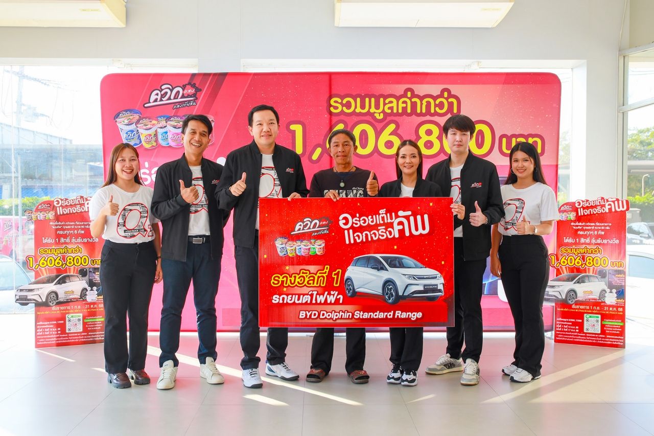 Grand Prize Giveaway Yotsaran Taemkongka, Executive Director of Marketing at Thai Foods Product Factory Company Limited, manufacturer and distributor of Wai Wai instant noodles, Quick Sab instant noodles, Wai Wai dried vermicelli, and Rosded seasoning powder, presented a BYD Dolphin Standard Range electric car worth 599,000 baht to Kitti Kwahhuaykwang, the lucky winner of the 'Delicious Full Cup, Real Giveaway Cup' campaign. Additionally, ten iPhone 16 Pro units and ten AirPods 4 were awarded to 20 other winners. The event was attended by Teeramet Laowanantpan, Deputy Sales Director; Nicharat Chamnanakit, Marketing Promotion Director (Marketing Department); and Issara Nasen, Product Marketing Manager at BYD Om Yai branch recently.