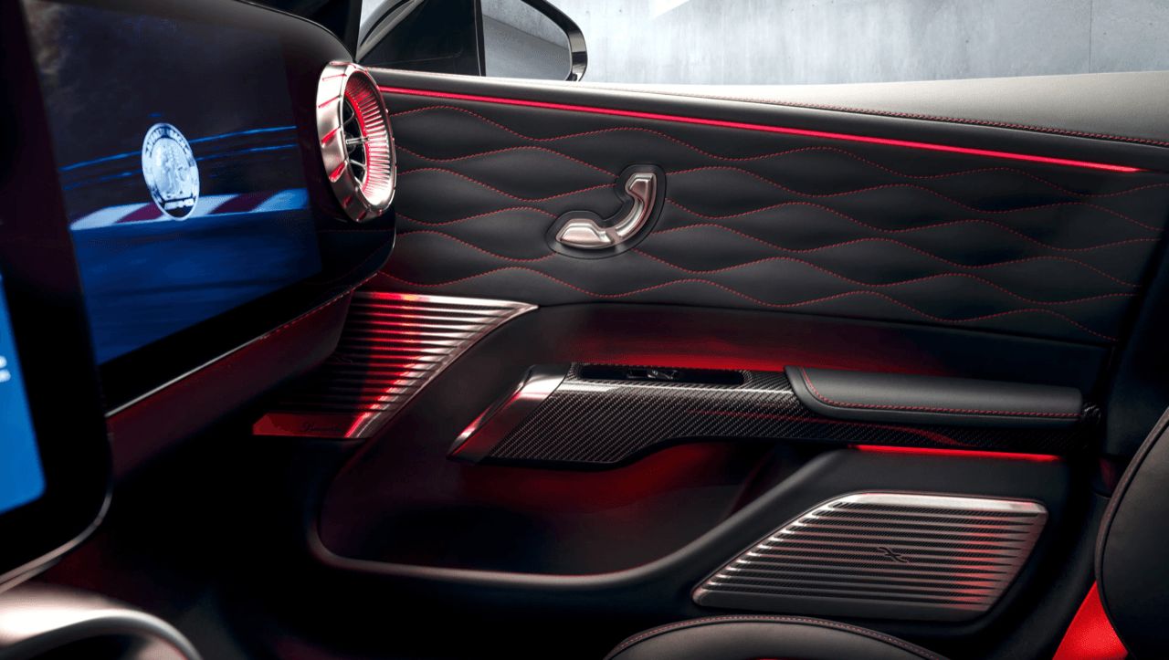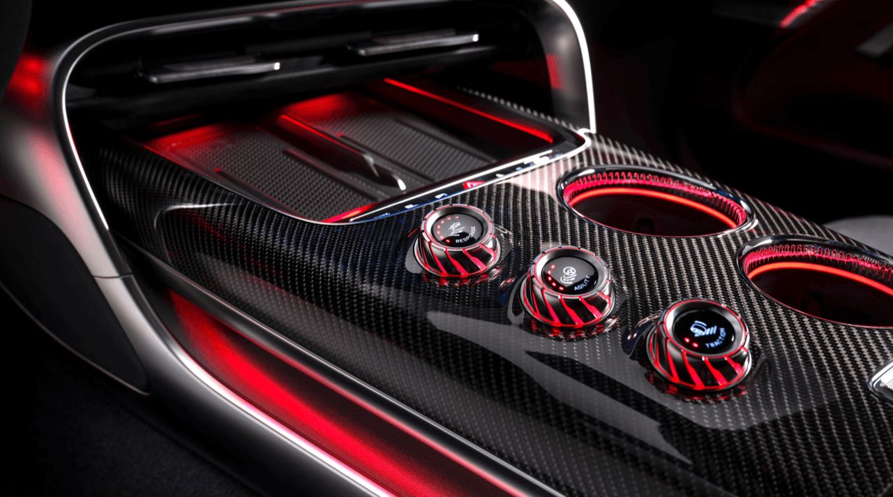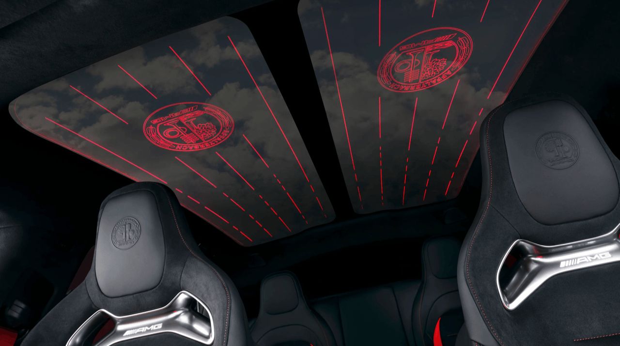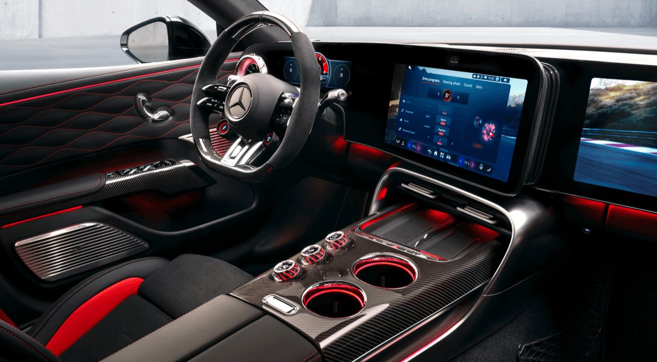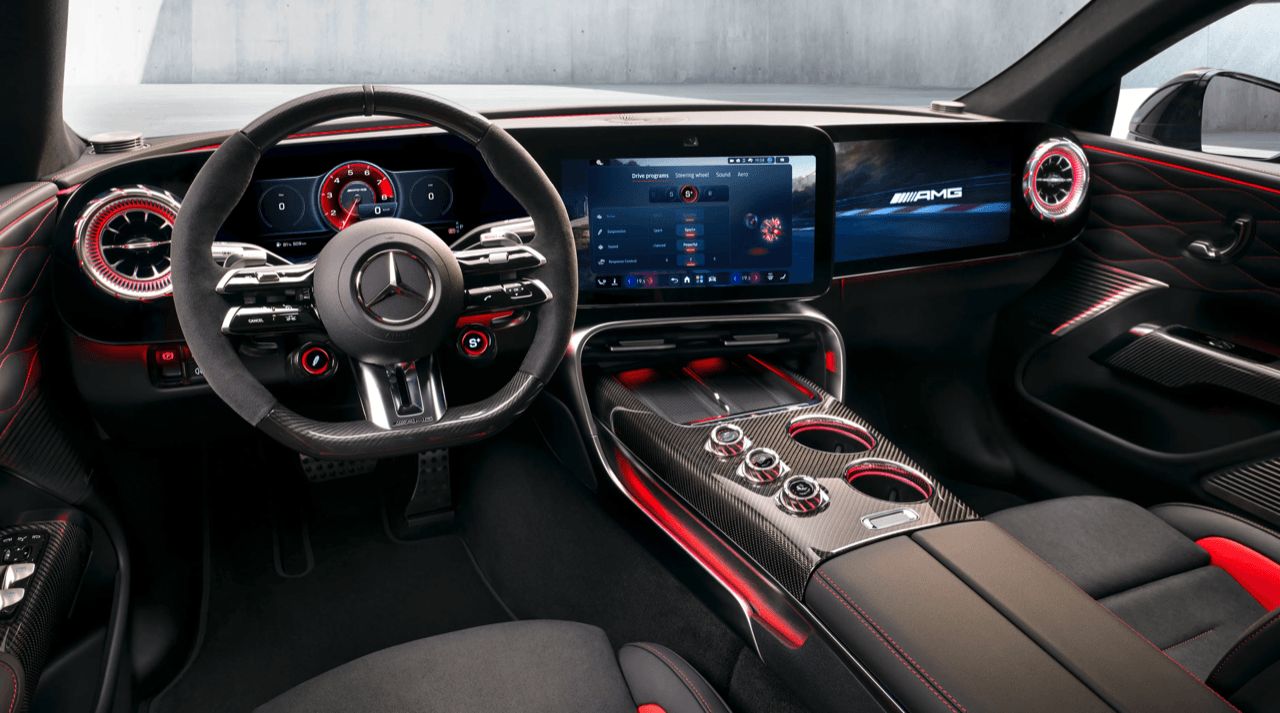Seating and Cabin Layout AMG Performance Seats: Designed to support the body during high-speed driving, with optional massage and ventilation functions. Seating configurations include four seats (with a split rear bench and center console) or five seats (with a full rear bench) for versatility. Premium materials include Nappa leather combined with Microfibre (MICROCUT) and sporty Carbon Fiber accents with contrasting stitching. Roof and Lighting Panoramic Roof 'SKY CONTROL' features a large glass panel with electrically adjustable transparency (switchable tint). At night, it can display AMG logos or graphics that change color with ambient lighting. Ambient Lighting offers up to 64 color options throughout the cabin, including door panels and the console. The Burmester High-End 3D sound system delivers premium audio with 1,170 watts output through 15 speakers, providing immersive surround sound. The center console includes two wireless phone charging pads and temperature-controlled cup holders.