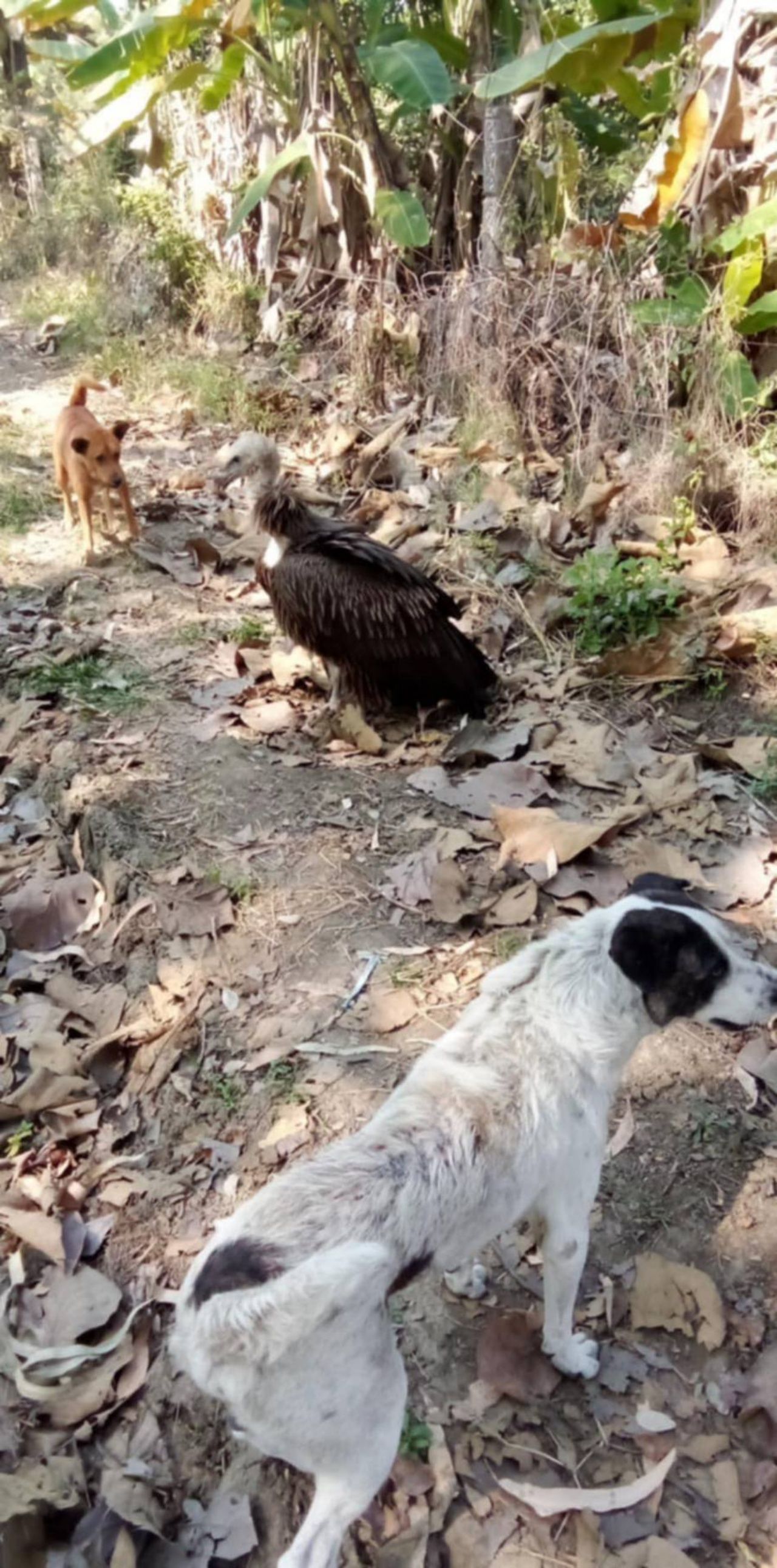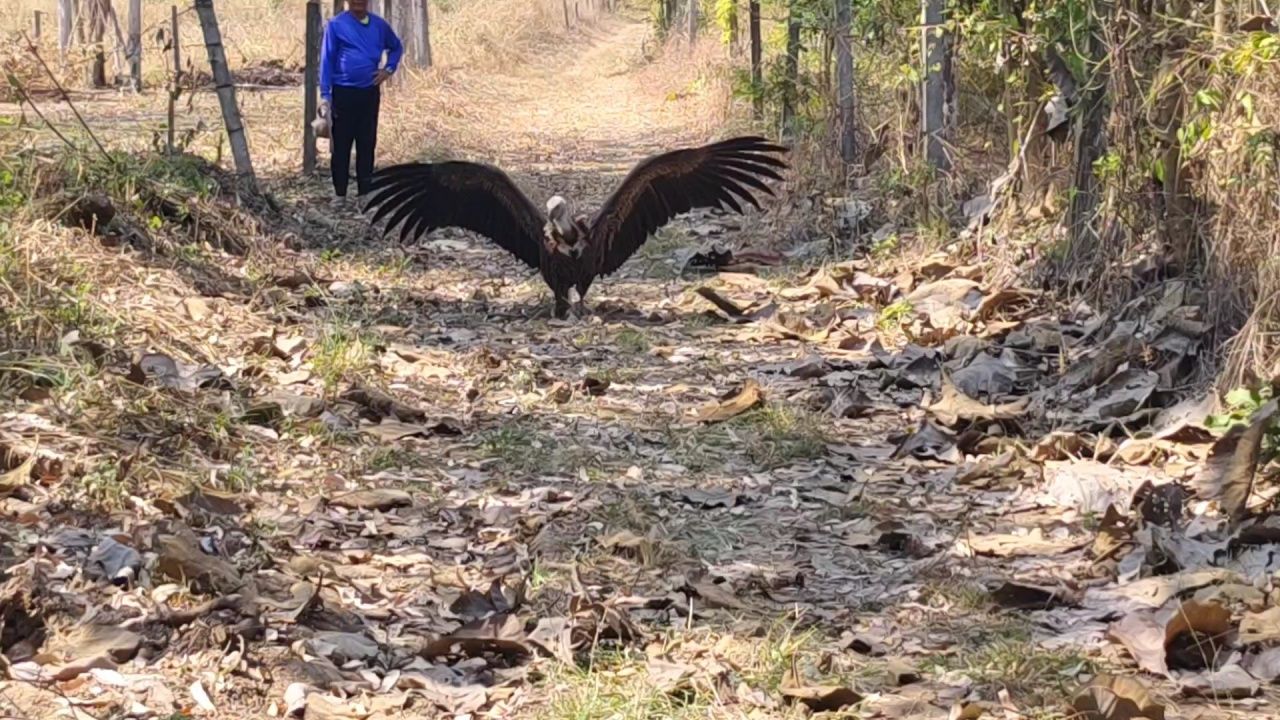 Shortly after, the vulture fell from the teak tree and lay motionless on the ground for a while before slowly standing up. Mr. Boonlue kept dogs away to protect the bird and contacted Mr. Nopparat Manat, a well-known local volunteer councilor of Wang Chao Municipality, who came to assist and coordinated with relevant authorities and experts.