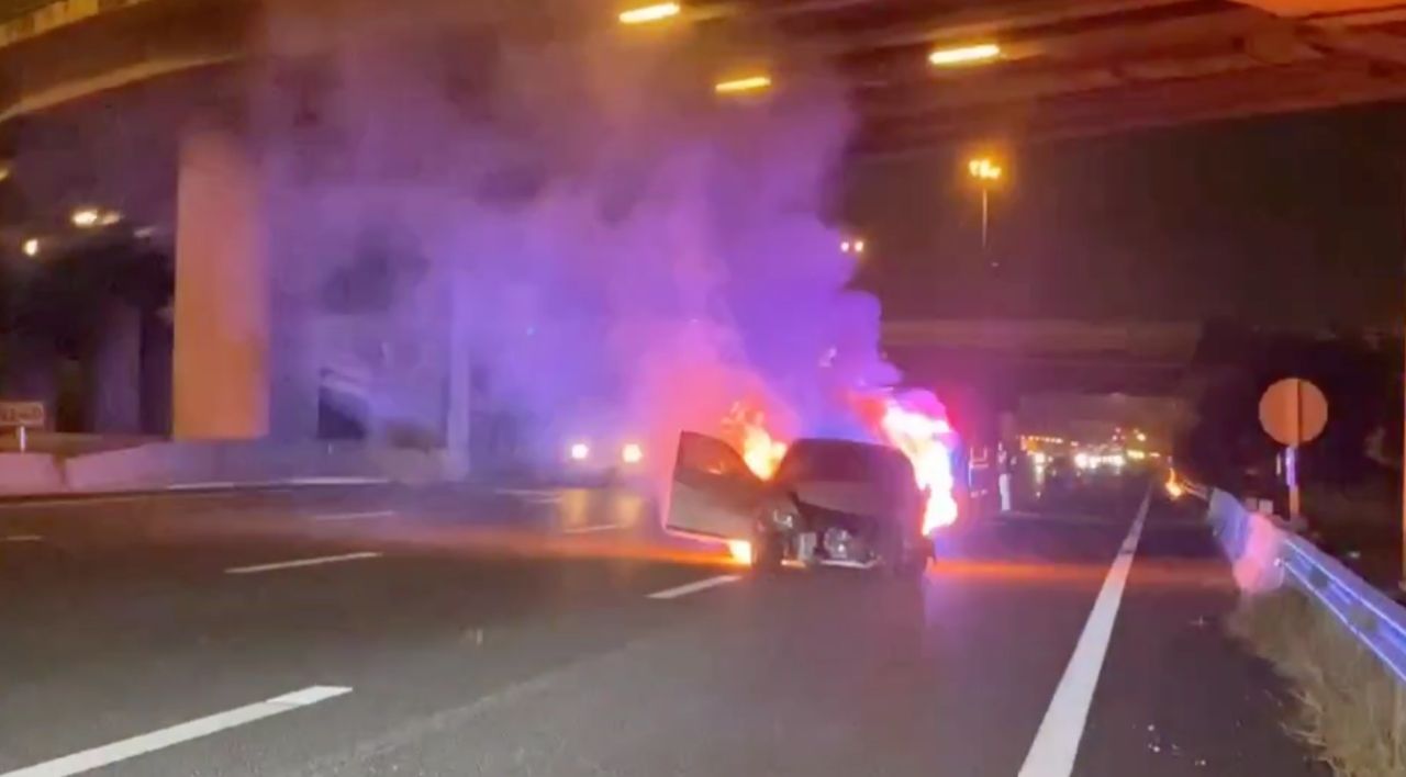A dramatic fire broke out involving a Lexus car in the middle of the motorway, with intense flames consuming the entire vehicle until only wreckage remained. Officials are currently investigating the cause.