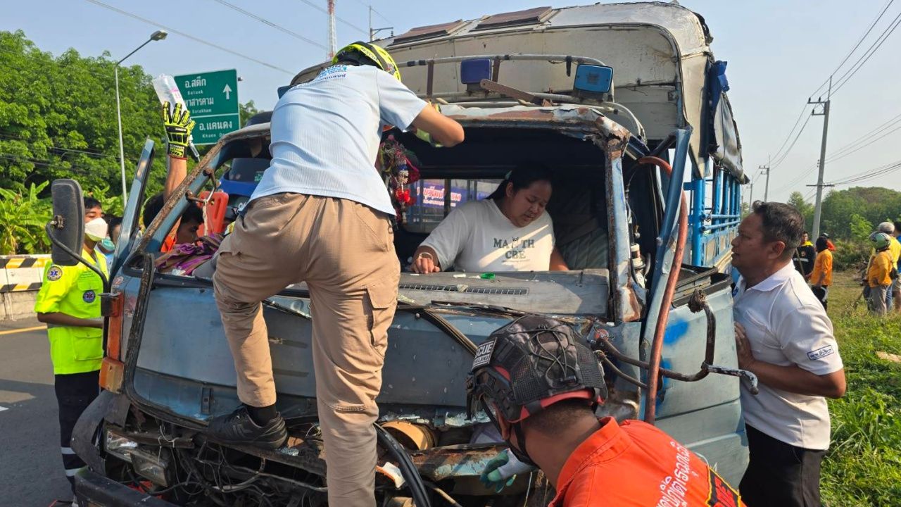 Mrs. Sujitta, 41, the pickup truck driver, said she was traveling with her family of four to work at a fertilizer factory across the road. Suddenly, the six-wheeled passenger vehicle, fully loaded with students and parents, crashed violently into the rear of her truck, causing it to lose control and hit a streetlight pole. Passengers in the truck bed were thrown in different directions.