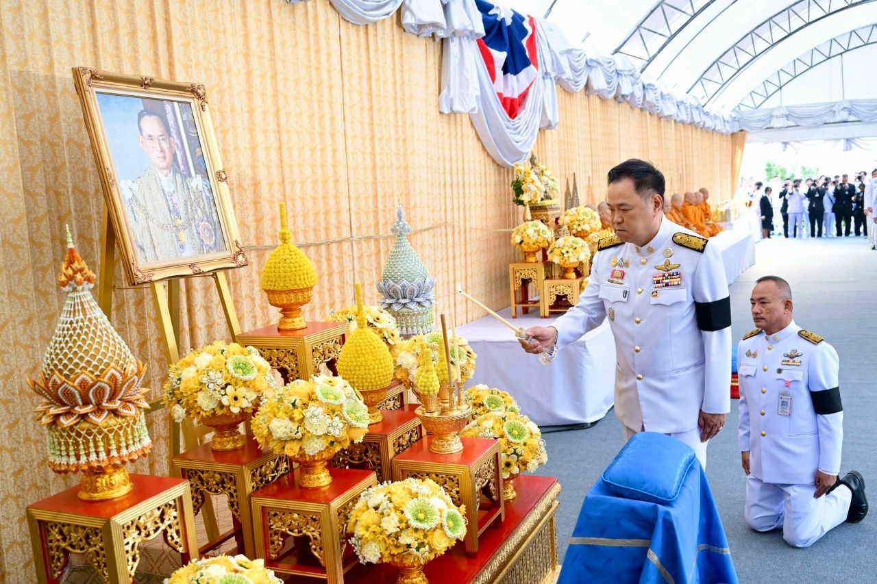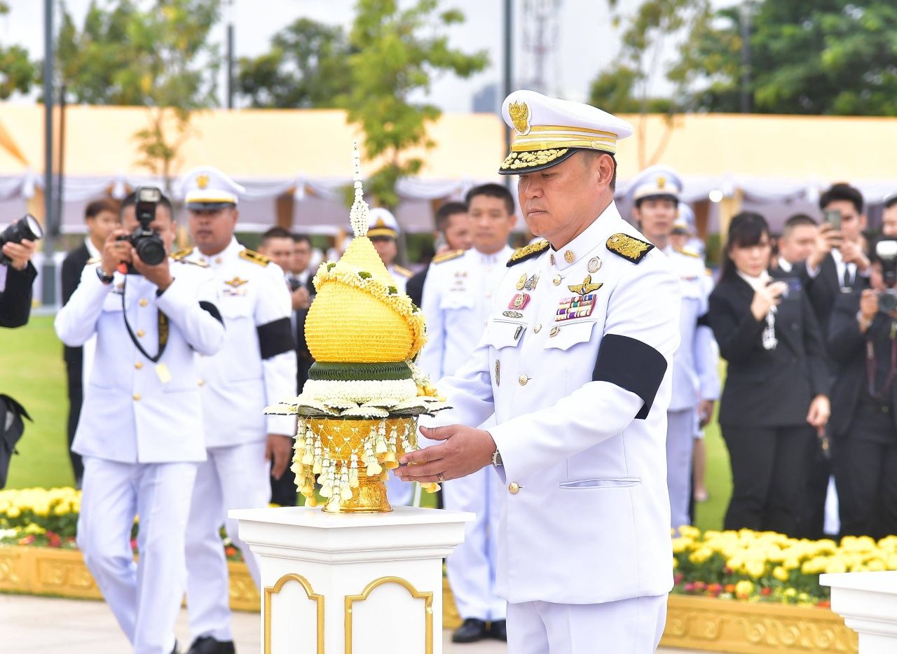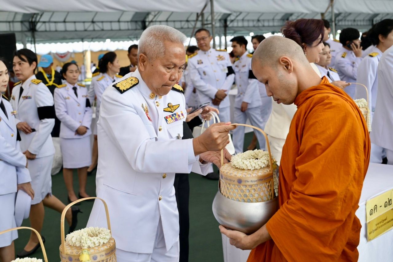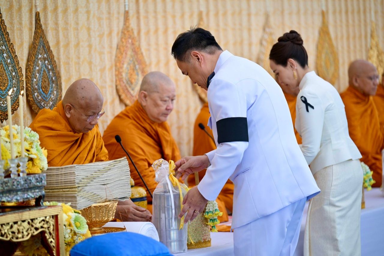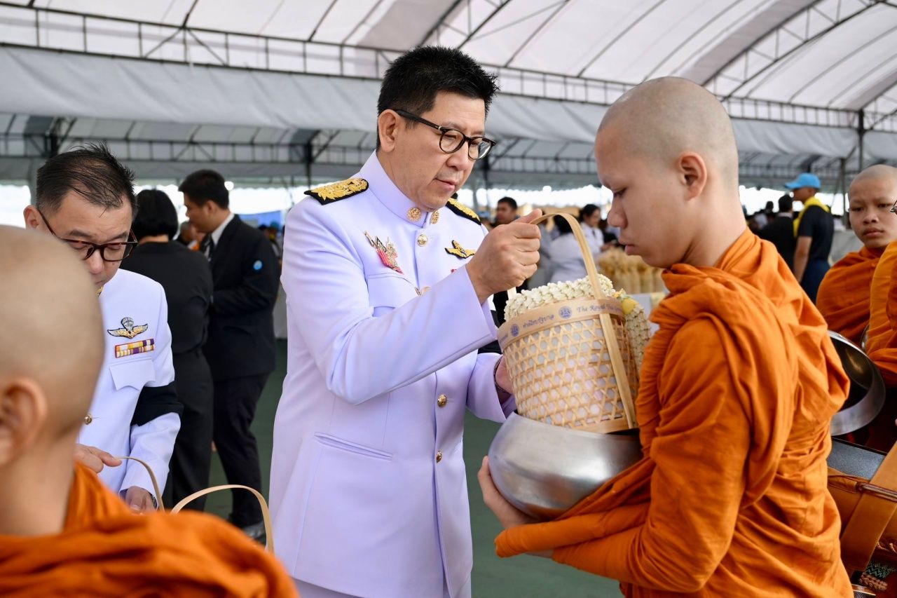 Upon arrival at Sanam Luang, ten monks took their seats on the designated platform. The Prime Minister lit candles to pay homage to the Triple Gem and incense sticks before the portrait of His Majesty King Bhumibol Adulyadej the Great. Officials invited the monks to give precepts, who then chanted Buddhist scriptures. Following this, offerings of robes and other necessities were presented to the monks, who then gave blessings. The Prime Minister poured water in a ritual to receive blessings, paid respects to the Triple Gem, and bowed before the royal portrait. He then led participants in offering alms to 189 monks. Concurrently, provincial governments held similar ceremonies at their respective provincial halls, while Thai embassies and consulates abroad also conducted ceremonies. Government and private sectors organized events at embassies and consulates.