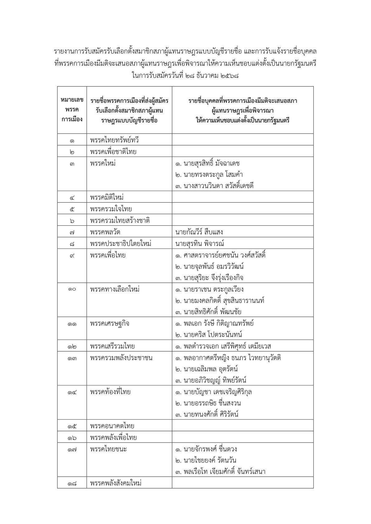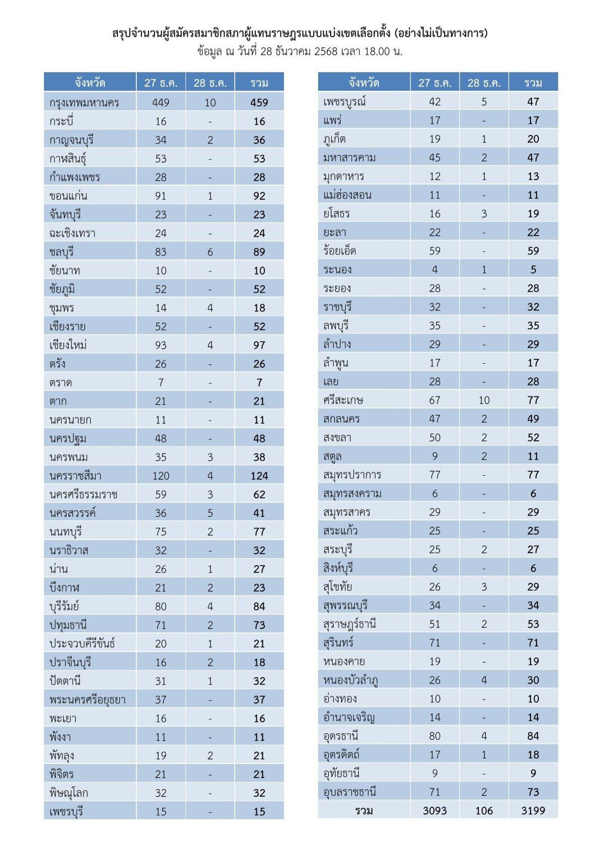 At 17:00 on 28 December 2025 GMT+7, at the Centara Life Hotel, Government Complex and Convention Center, Chaeng Watthana, Lt. Commander Pasakorn Siriphakayaporn, Deputy Secretary-General of the Election Commission, summarized the overall picture of MP registrations for both constituency and party-list elections. Overall, 3,199 candidates registered for the 400 constituency seats over the past two days, according to data as of 16:45 on 28 December 2025 GMT+7.
