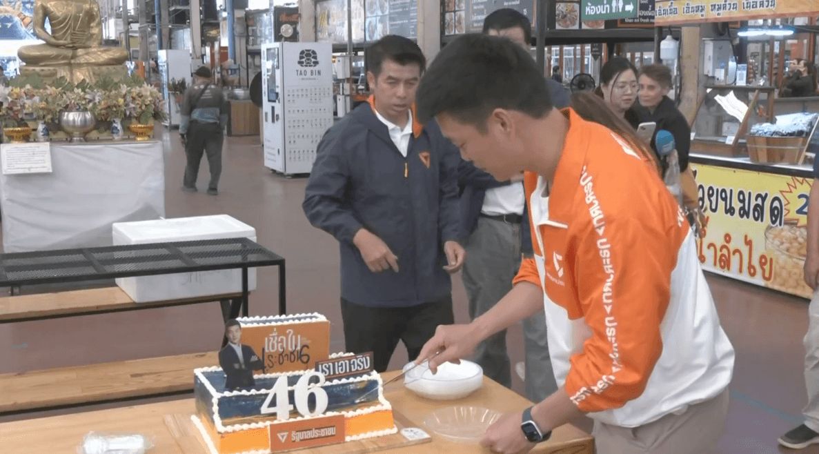 The cake was brought by fans from Chiang Mai who have followed since the Future Forward Party era. The fan group sang "Happy Birthday" to Mr. Natthapong, who responded, "Thank you very much, several months in advance." Mr. Witwisit then joked, "He’s going to celebrate the new prime minister," prompting laughter from Mr. Natthapong. Afterwards, he cut the cake for his supporters.Tags: [Politics, Campaign, Supporters, Future Forward Party, Celebration]