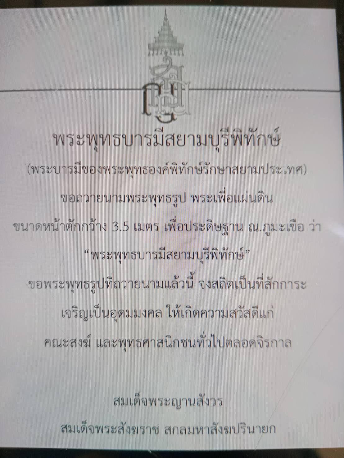 An inscription states, “May the Buddha statue, as named, be enshrined as an object of worship and bring auspiciousness and well-being to the monastic community and all Buddhists forever,” with kindness from Somdet Phra Nyanasamvara, the Supreme Patriarch.