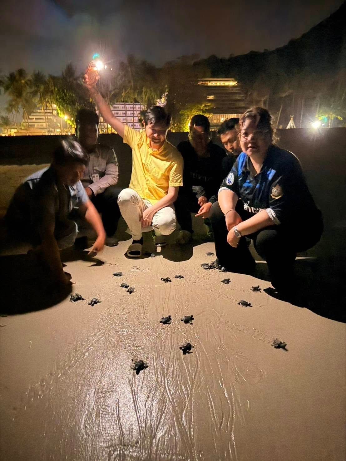 Eighty-one baby turtles hatched on Magha Puja Day after their mother laid eggs on Patong Beach and they emerged early in the morning following a total incubation period of 52 days. The survival rate was 98.76%, with one turtle dying after being carried into a burrow by a ghost crab.