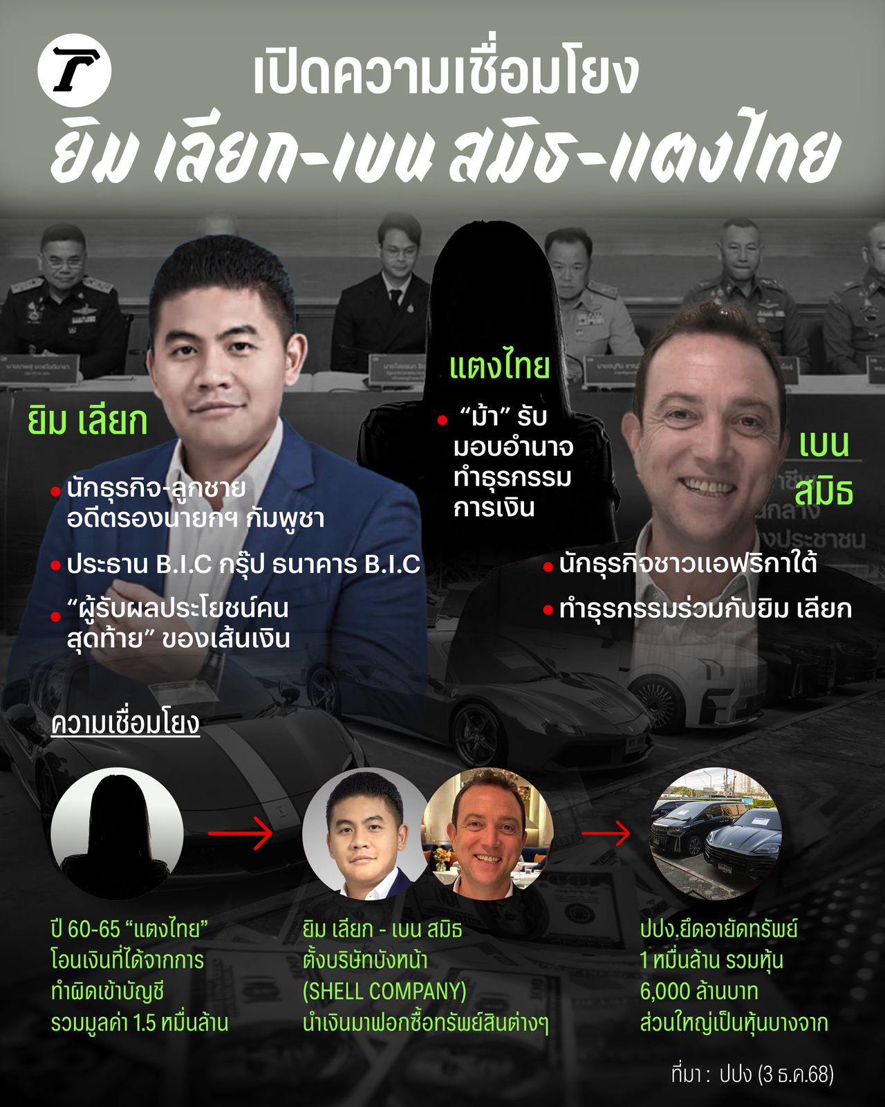 The Secretary-General added that the frozen shares are valued at approximately 6 billion baht (as of 28 Nov), involving many companies, mostly shares of a "certain company." These assets were verified by AMLO as linked to crimes and will be frozen for 90 days. Owners have 30 days to prove the assets are not related to wrongdoing, after which the freeze can be lifted if successful. Who are Yim Liak, Ben Smith, and Tang Thai? Mr. Yim Liak is a Cambodian businessman, son of a former Cambodian Deputy Prime Minister. He is married to a Thai socialite and serves as Chairman of B.I.C Group, operating in real estate, energy, and banking through B.I.C Bank. Previously,