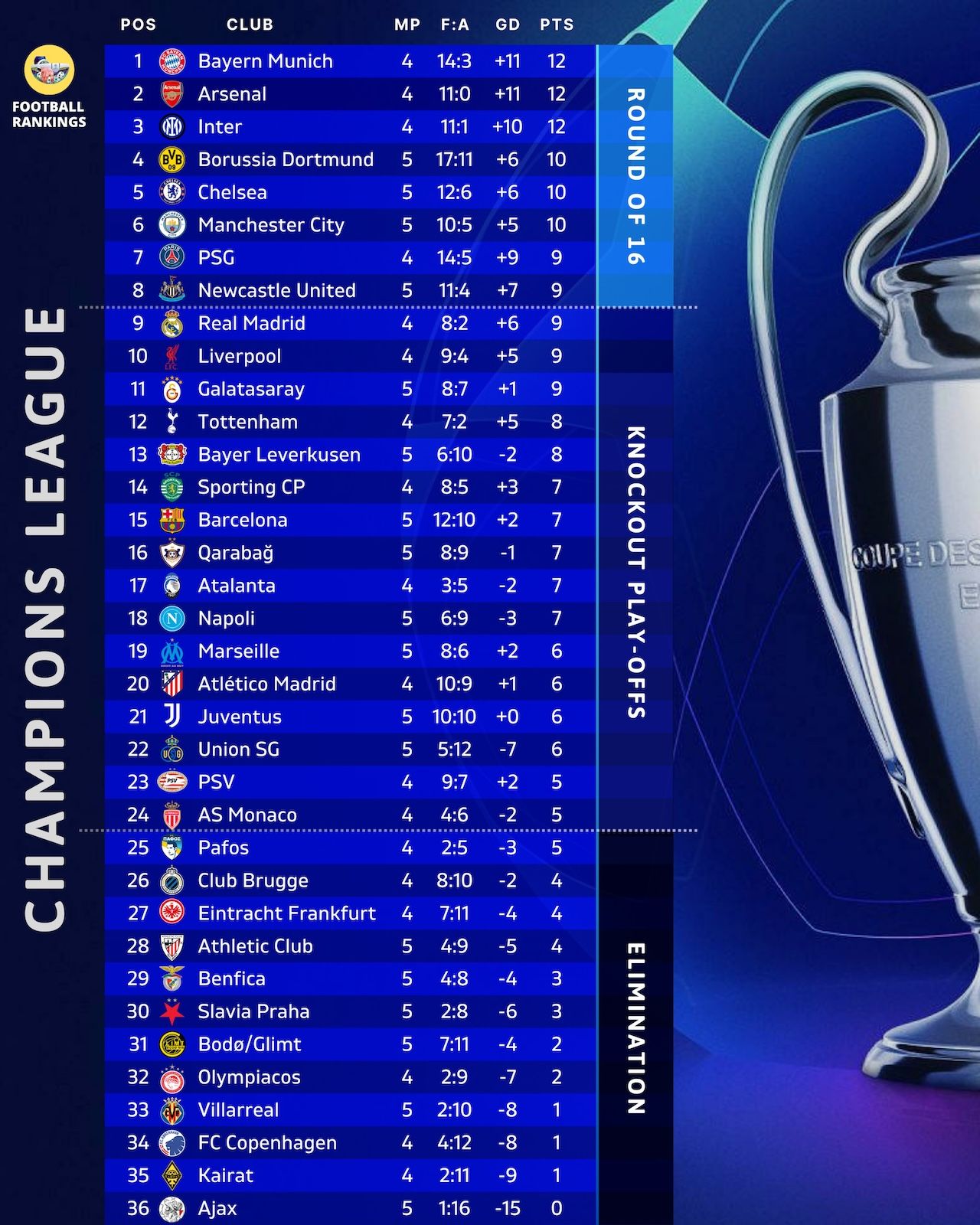 Bayern Munich, nicknamed the "Bavarian Tigers," still leads the standings with 12 points, tied with Arsenal in second place and Inter Milan in third, but Bayern has a better goal difference.