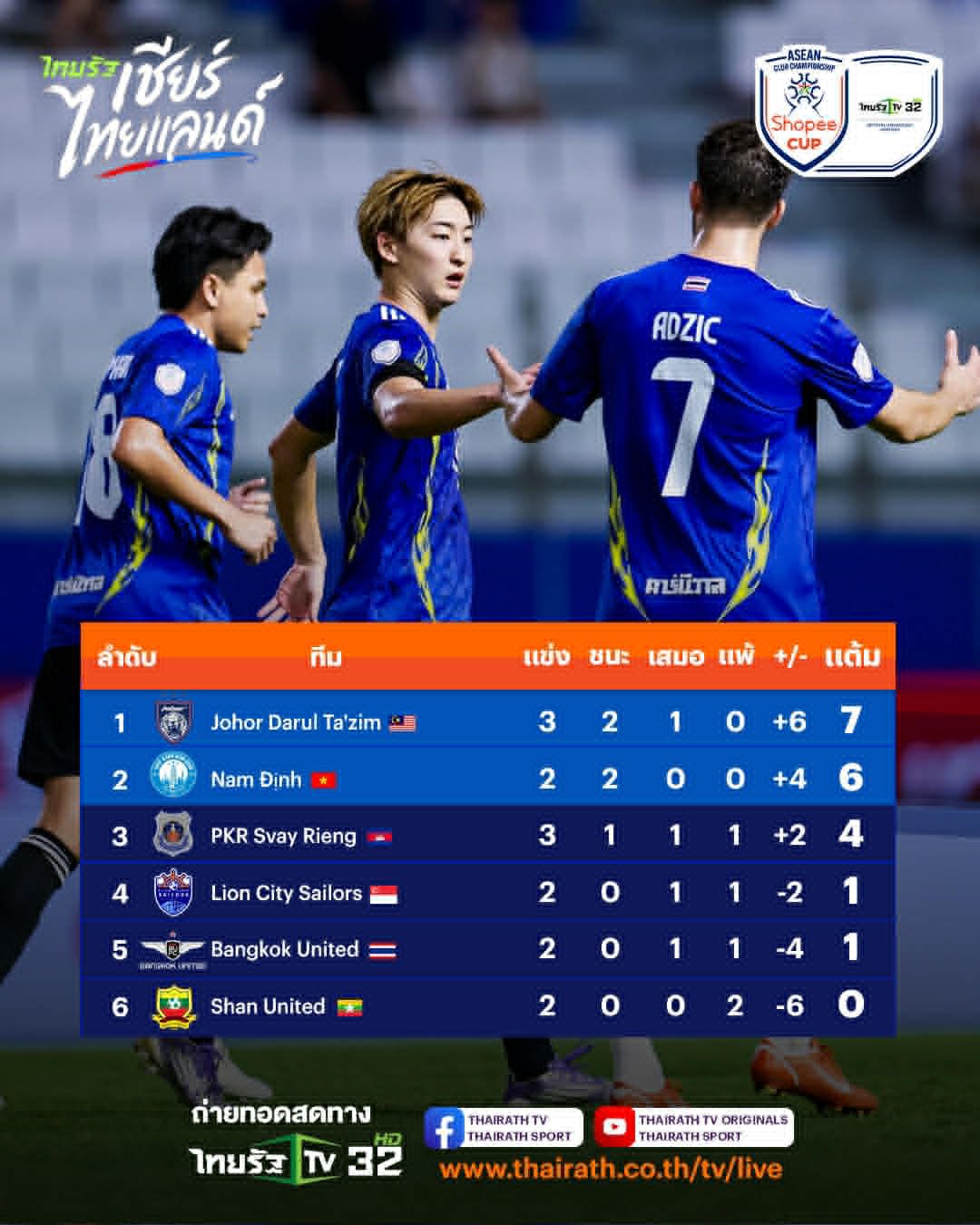 On 4 Dec 2025 GMT+7, the Shopee Cup 2025-26 standings after the second group stage matchday for Group B were updated. Shan United lost 0-3 to Nam Dinh FC, while Svay Rieng FC drew 2-2 with Johor Darul Ta'zim. Meanwhile, "Khaeng Thep" True Bangkok United also drew 2-2 against Lion City Sailors.
