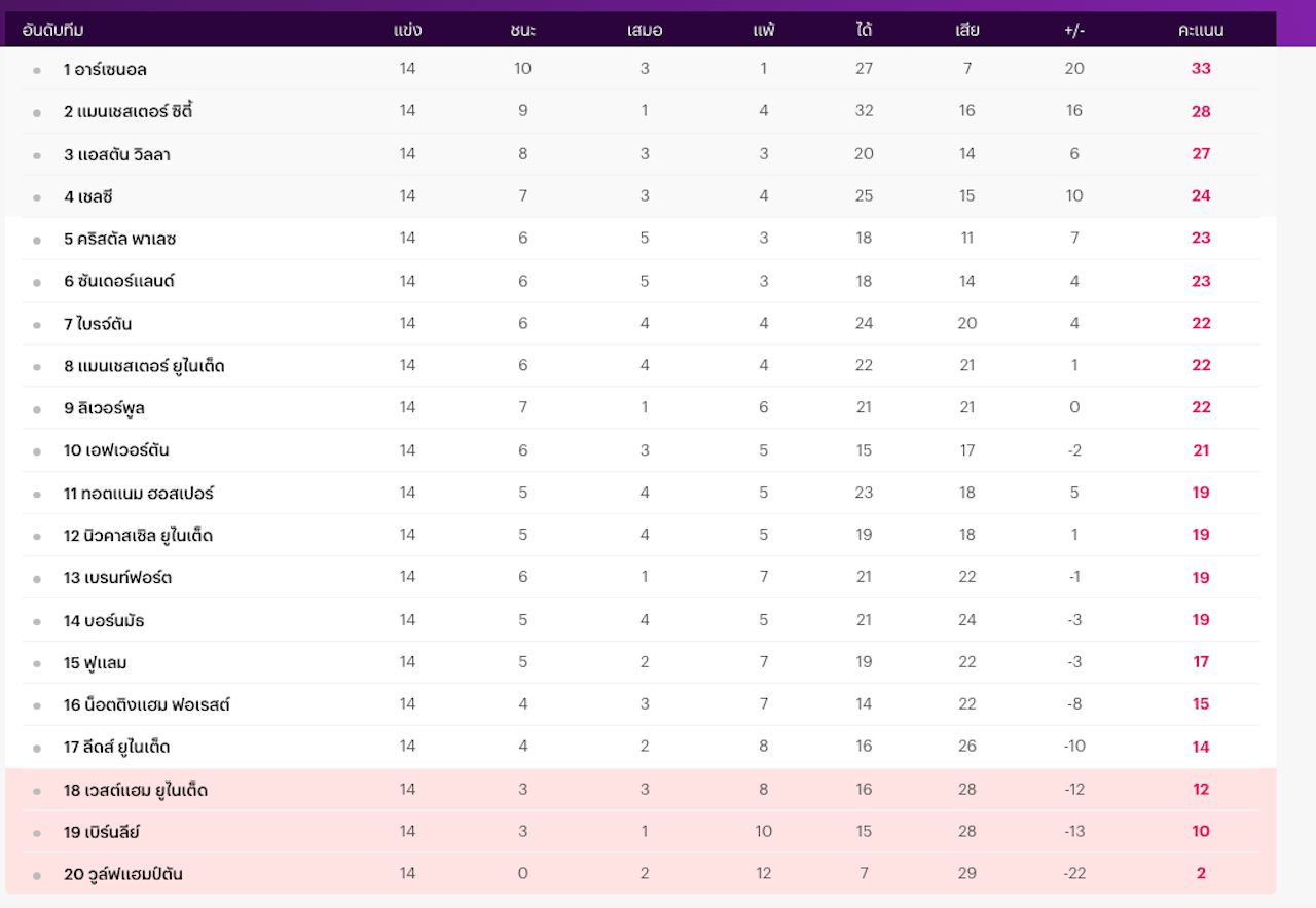 In the relegation zone, West Ham remains in 18th place with 12 points, Burnley is 19th with 10 points, and Wolverhampton is bottom of the table in 20th place with just 2 points.