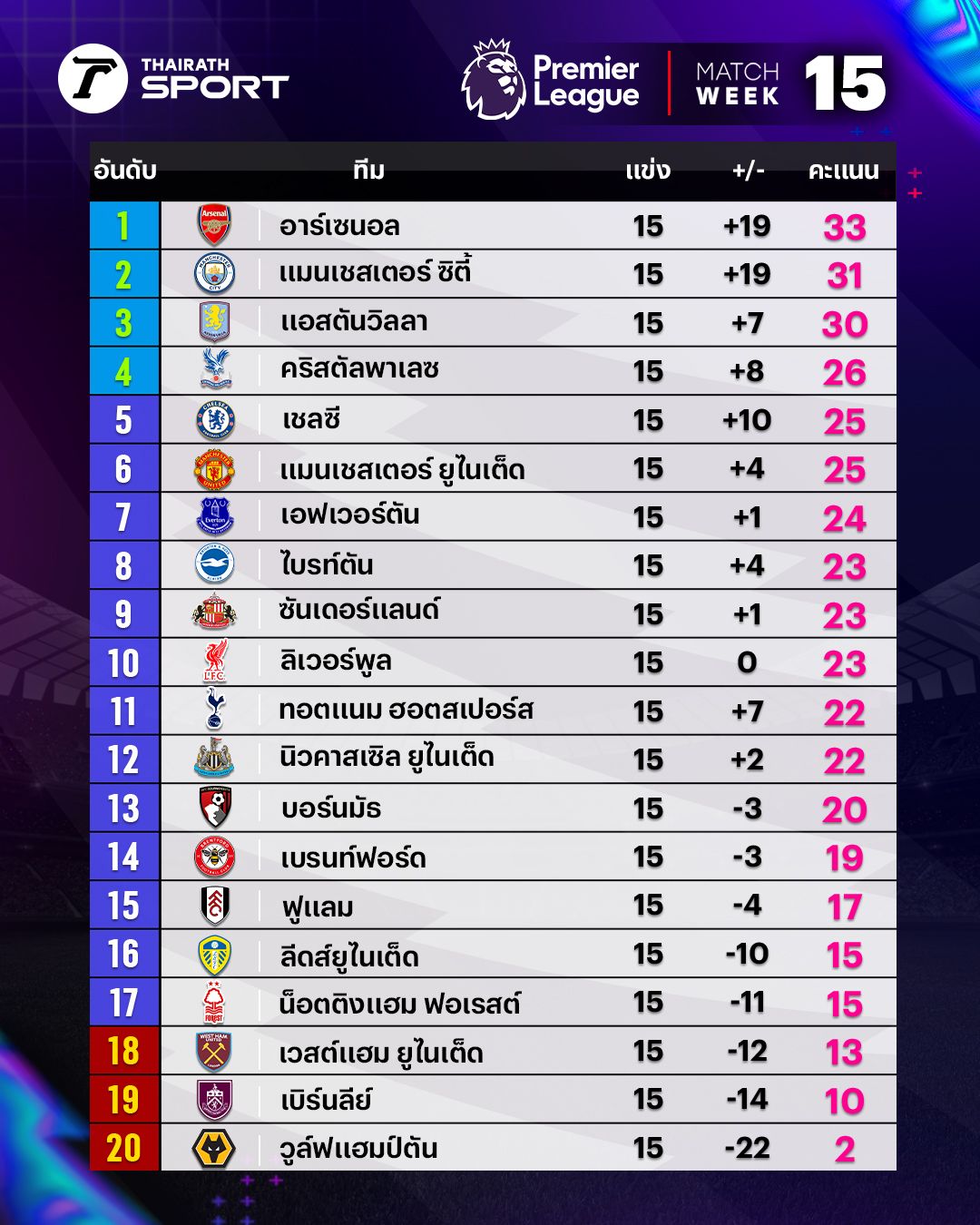 Arsenal remains the Premier League leader after week 15 but suffered a 1-2 away defeat to Aston Villa, keeping them at 33 points.