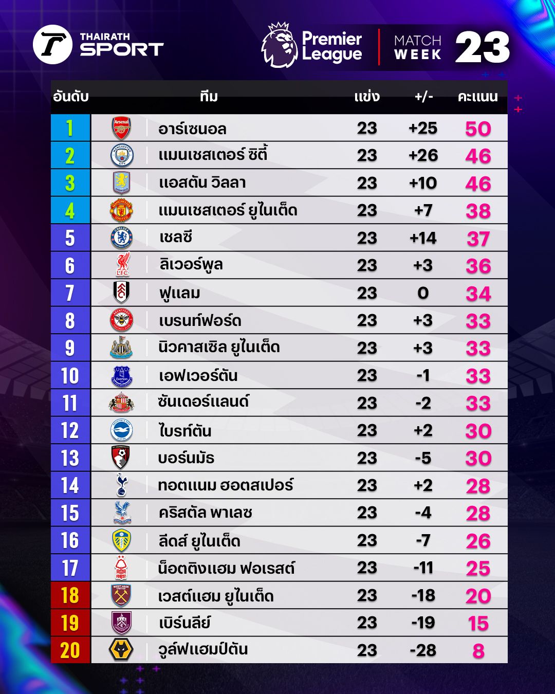 18. West Ham United 20 points