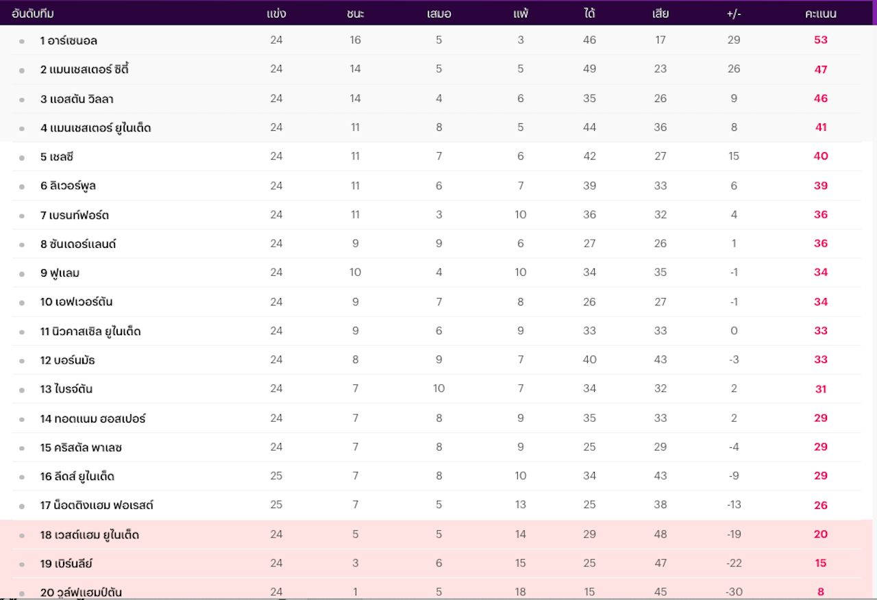 The leader remains Arsenal with 53 points, followed by second place Manchester City with 47 points, third place Aston Villa with 46 points, fourth place Manchester United with 41 points, fifth place Chelsea with 40 points, and sixth place Liverpool with 39 points.