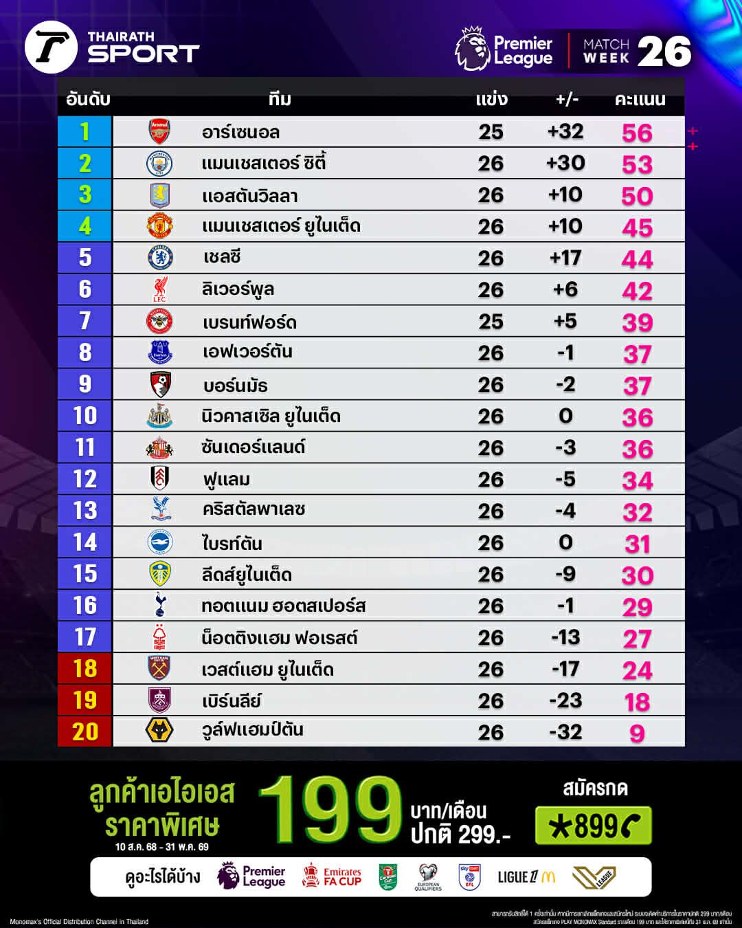 Summary of the English Premier League 2025-26 standings as of 12 Feb 2026 GMT+7.