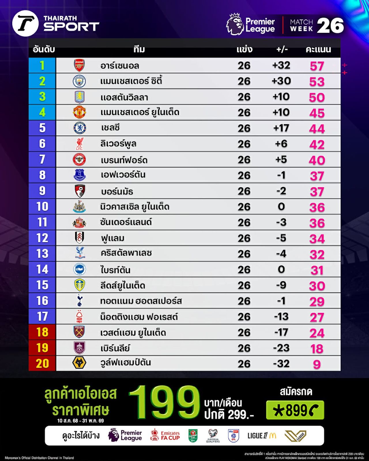 It was revealed that Arsenal, nicknamed "The Gunners," who managed only a 1-1 away draw against Brentford last night, remain top of the table with 57 points. However, they lead second-placed Manchester City by just 4 points, both having played 26 matches.