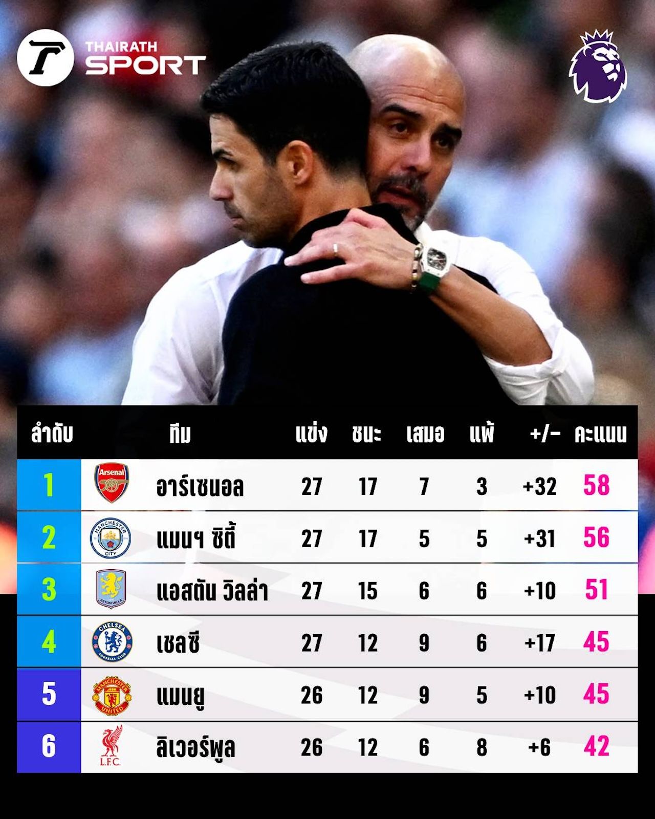 Following in third place is Aston Villa with 51 points, fourth is Chelsea with 45 points, and fifth is Manchester United also with 45 points but behind Chelsea on goal difference and having played one fewer match. Liverpool holds sixth place with 42 points.