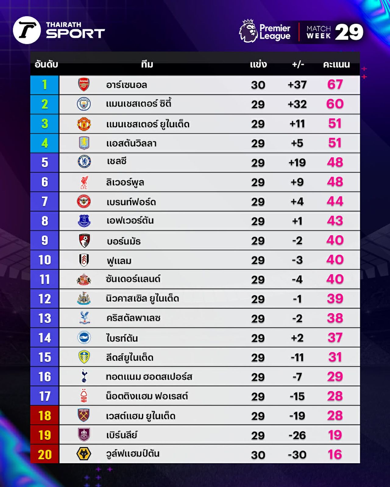 In other positions, the "Gunners" Arsenal remain top of the table with 67 points, followed by second-place Manchester City with 60 points, third-place Manchester United with 51 points, fourth-place Aston Villa also with 51 points, fifth-place Chelsea with 48 points, and sixth-place Liverpool also with 48 points but behind Chelsea on goal difference.