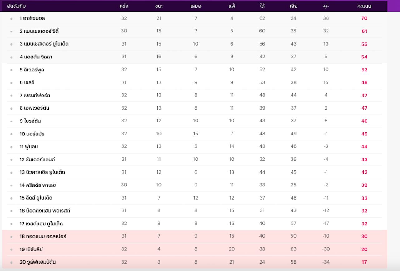 At the bottom of the table, eighteenth-placed Tottenham has 30 points, nineteenth-placed Burnley has 20 points, and twentieth-placed Wolverhampton, at the bottom, has 17 points.