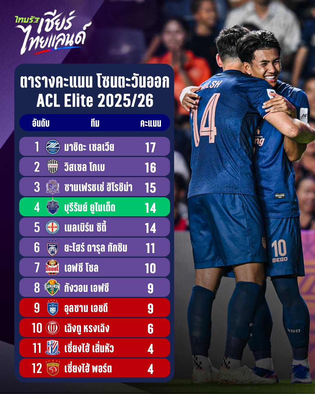 4. Buriram United - 14 points (+2 goal difference, 10 goals scored, 8 conceded)