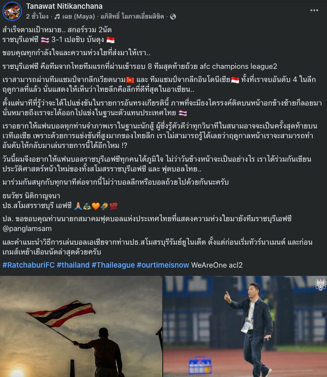 On 19 Feb 2026 GMT+7, Sia Fluke Thanawat Nitikanchana, chairman of Ratchaburi FC, posted on his personal social media after making history by reaching the quarterfinals of the Asian Club Championship for the first time in the club's history. Tags:[