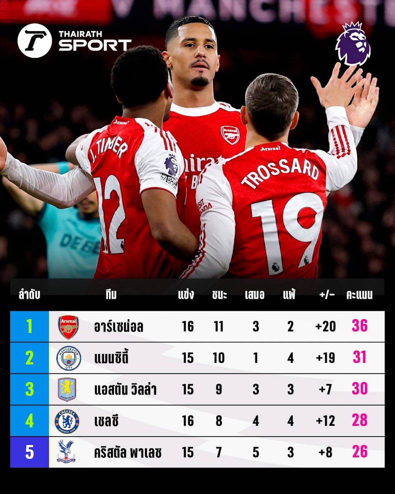 Arsenal, known as the "Gunners," continue to hold the top spot firmly after defeating Wolverhampton 2-1 last night, bringing their total to 36 points. They lead second-placed Manchester City by 5 points, although City have played one more match.