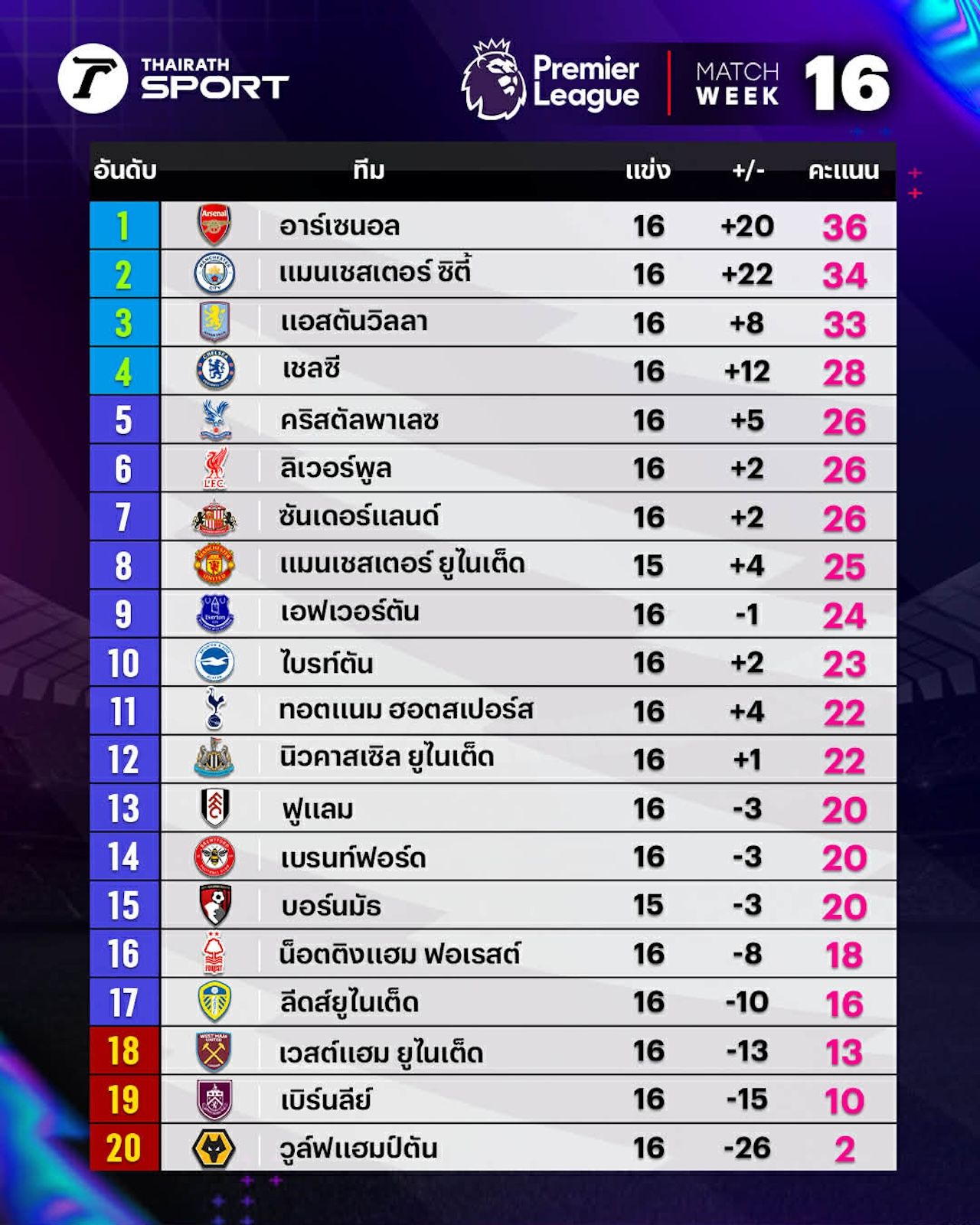 Summary of the English Premier League 2025-26 season standings as of 15 Dec 2025 GMT+7. 2025-26 Premier League table update on 15 Dec 2025.
