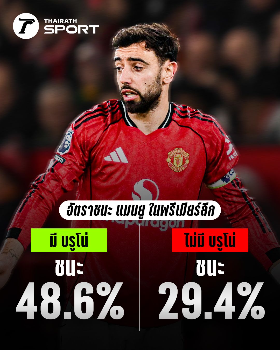 - With Bruno in Premier League matches: Manchester United wins 48.6%.