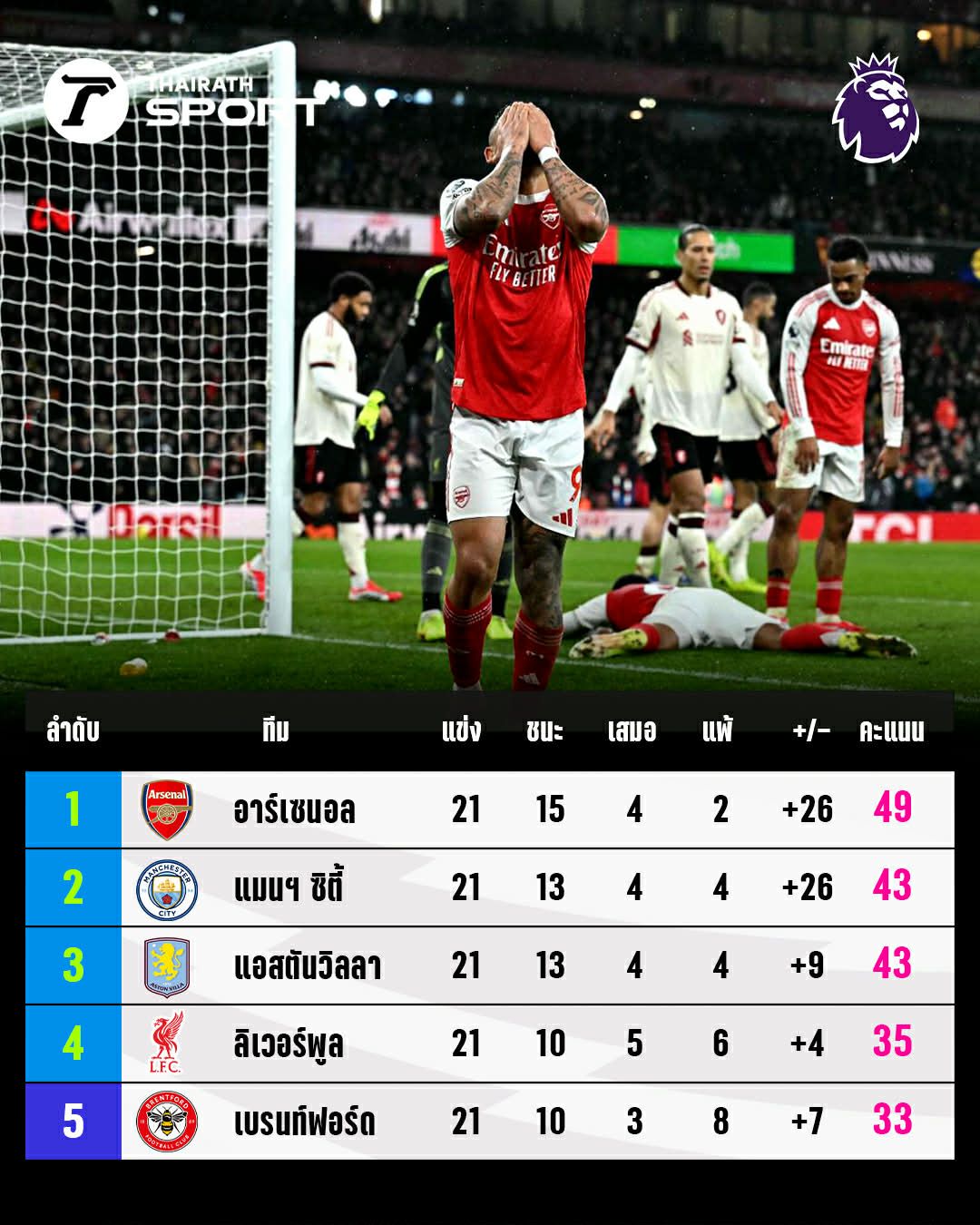 It turns out the "Gunners" Arsenal have started to falter after drawing 0-0 at home against the "Reds" Liverpool last night, earning just one point to reach 49 points, but they still lead the league with a six-point advantage over second-placed Manchester City.