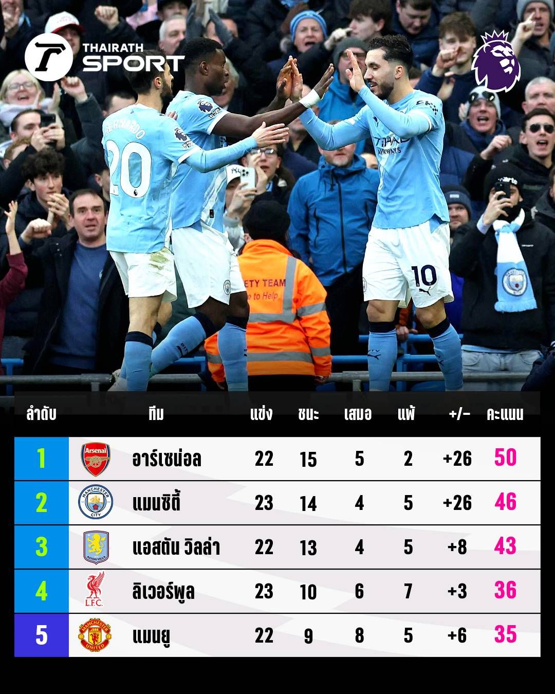 "The Citizens" Manchester City, who beat Wolverhampton 2-0 last night, have increased their points to 46, holding 2nd place and closing in on the leaders "The Gunners" Arsenal, who have 50 points, 4 points ahead but with one more game played.