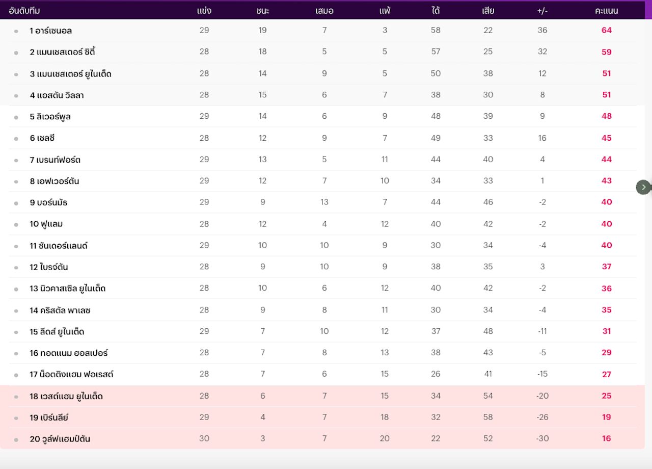 Summary of the English Premier League 2025-26 season standings, latest update as of 4 Mar 2026 GMT+7.