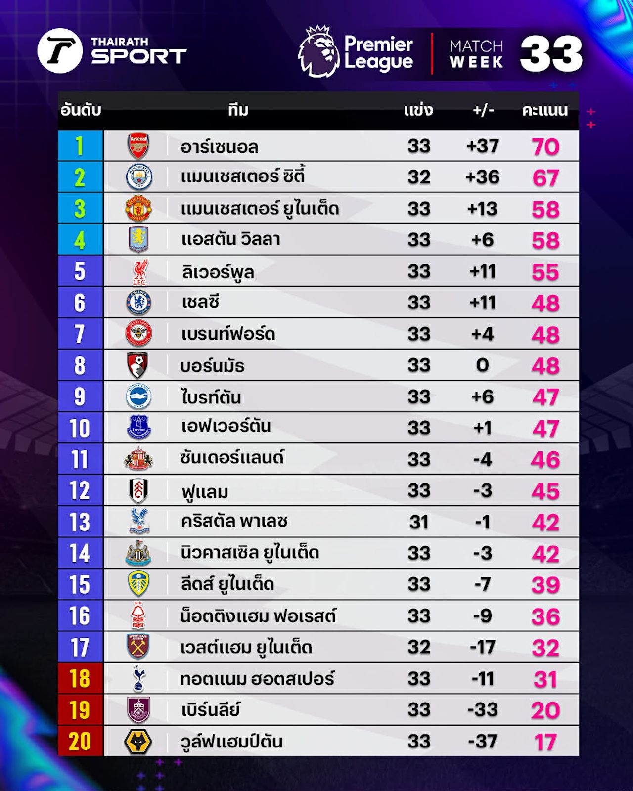 Summary of the latest English Premier League standings as of 20 Apr 2026 GMT+7.