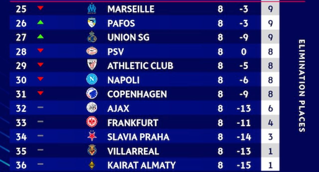 The other eight teams that were stopped in their tracks are Pafos, Union Saint-Gilloise, Athletic Bilbao, Copenhagen, Eintracht Frankfurt, Slavia Prague, Villarreal, and Kairat Almaty.