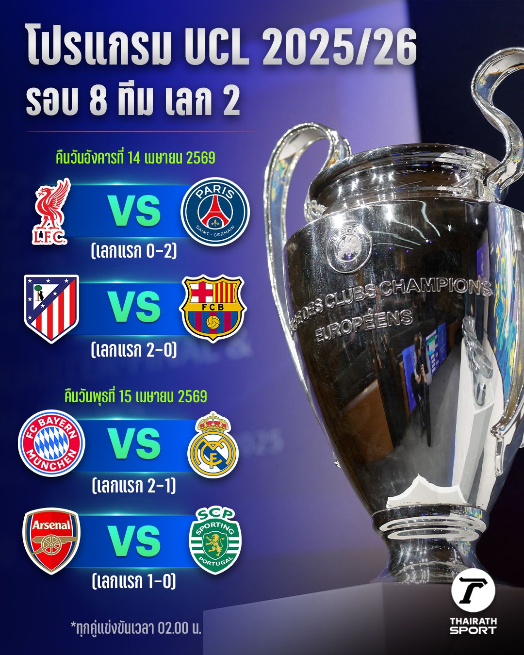 On 14 April 2026, the UEFA Champions League 2025-26 quarterfinals second leg schedule is announced, deciding the four semifinalists. Matches will be held on 14-15 April, featuring major fixtures over both nights with live broadcast channels as follows.